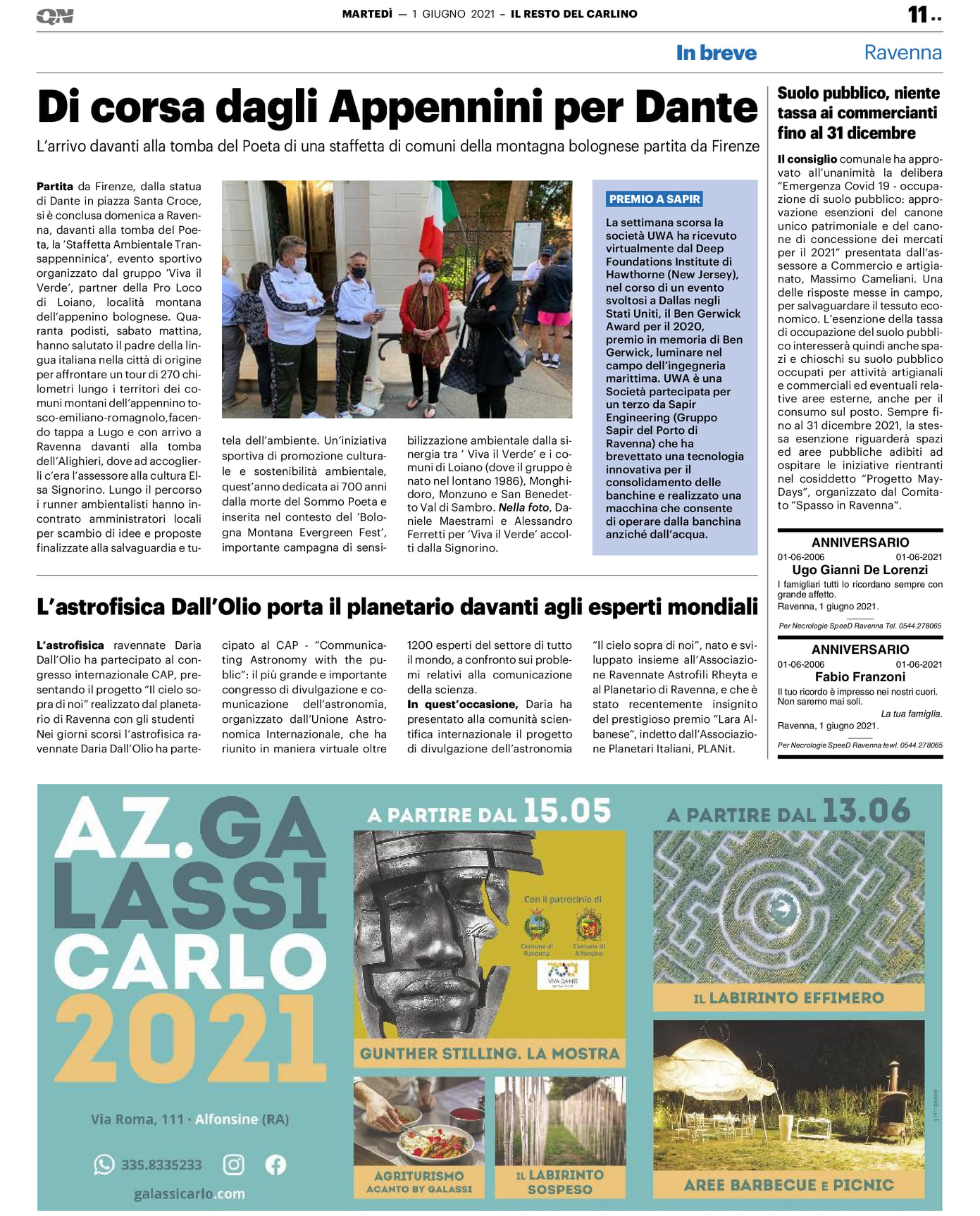 Grande successo della Staffetta Ambientale Transappenninica, partita sabato 29 maggio da Firenze e conclusasi domenica 30 maggio a Ravenna, davanti alla tomba di Dante.