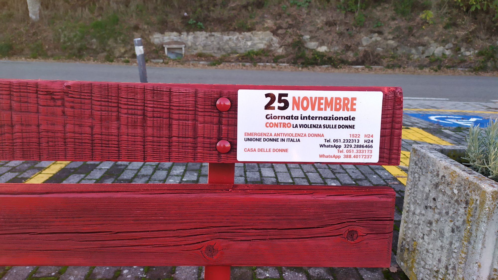 Un grande dono ci è stato fatto quest'anno da parte di una nostra giovane concittadina, che in prima persona ha vissuto sulla sua pelle questa terribile esperienza; ha voluto donarci due targhette che riportano i numeri utili e di emergenza a sostegno delle donne che subiscono violenza, da apporre sulle panchine rosse del nostro comune. Questi numeri si possono usare in ogni momento e a volte è sufficiente un semplice messaggio per essere aiutate.