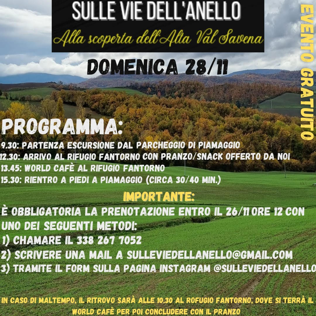 Domenica 28 novembre 2021, presso l'Alpe di Monghidoro, si terrà un evento gratuito riservato ai maggiorenni under35, al fine di raccogliere idee e proposte sulla realizzazione di un tracciato escursionistico ad anello tra i comuni di Bologna Montana (Loiano, Monghidoro, Monzuno e San Benedetto Val di Sambro).