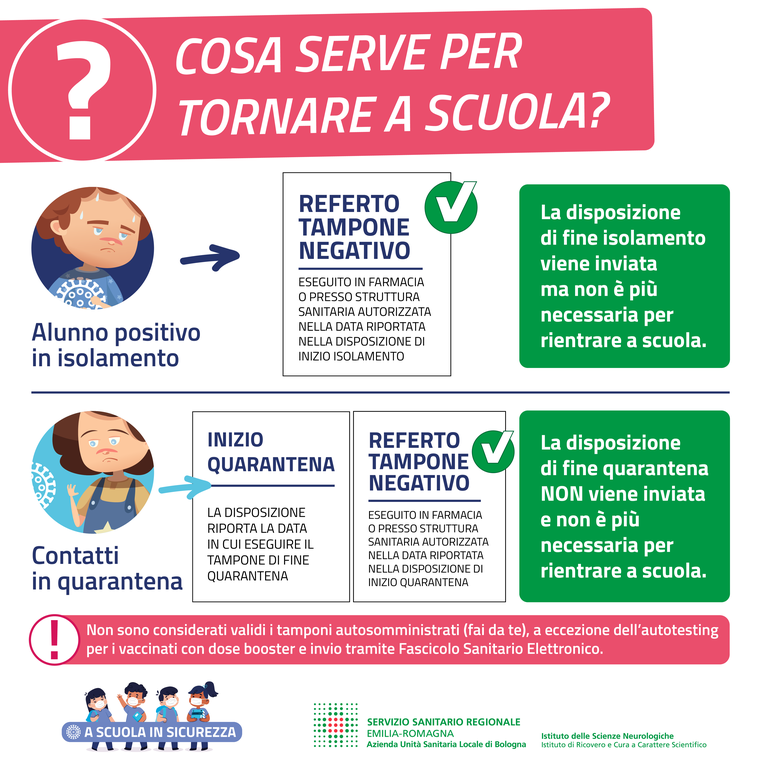 Per i casi positivi posti in isolamento, il rientro a scuola può avvenire a seguito della presentazione di esito negativo di tampone antigenico o molecolare, effettuato in una farmacia o presso una struttura sanitaria autorizzata, nei tempi stabiliti nella disposizione di inizio isolamento e secondo le indicazioni del proprio medico di medicina generale o pediatra. Non è più necessario presentare la disposizione di fine isolamento per rientrare a scuola.