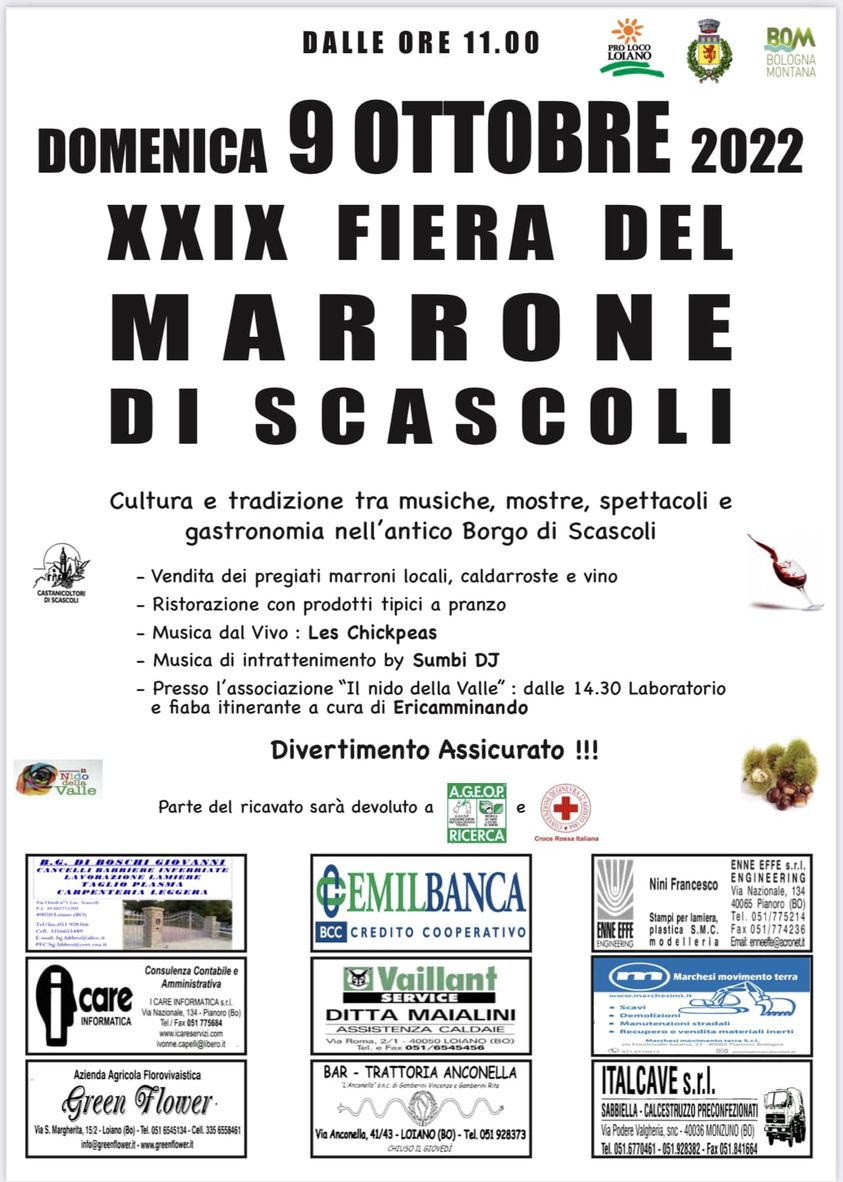Domenica 9 ottobre 2022, a partire dalle ore 11 del mattino, avrà finalmente luogo la XXIX edizione della Fiera del marrone di Scascoli.