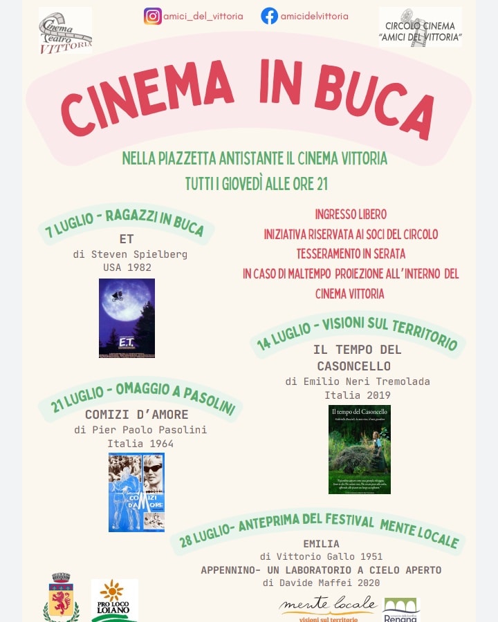L'iniziativa è riservata ai soci del Circolo Amici del Vittoria (possibilità di tesseramento nella serata) e si terrà presso la piazzetta antistante il Cinema. In caso di maltempo le proiezioni si terranno all'interno.
