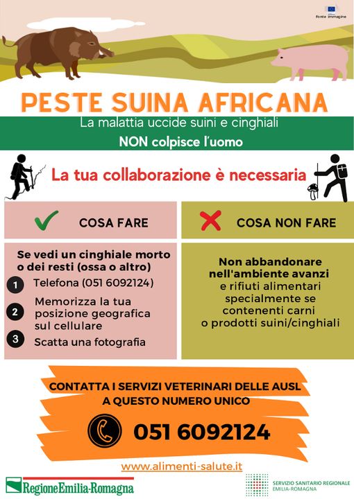 Dopo che in Piemonte e in Liguria sono stati rilevati i primi casi di infezione da Peste Suina Africana, una malattia virale altamente contagiosa che colpisce suini domestici o cinghiali ma non infetta l'uomo, la Regione Emilia-Romagna ha attivato un servizio telefonico per incentivare la prevenzione e agevolare una mappatura precisa delle zone a rischio e fermare eventuali contagi.