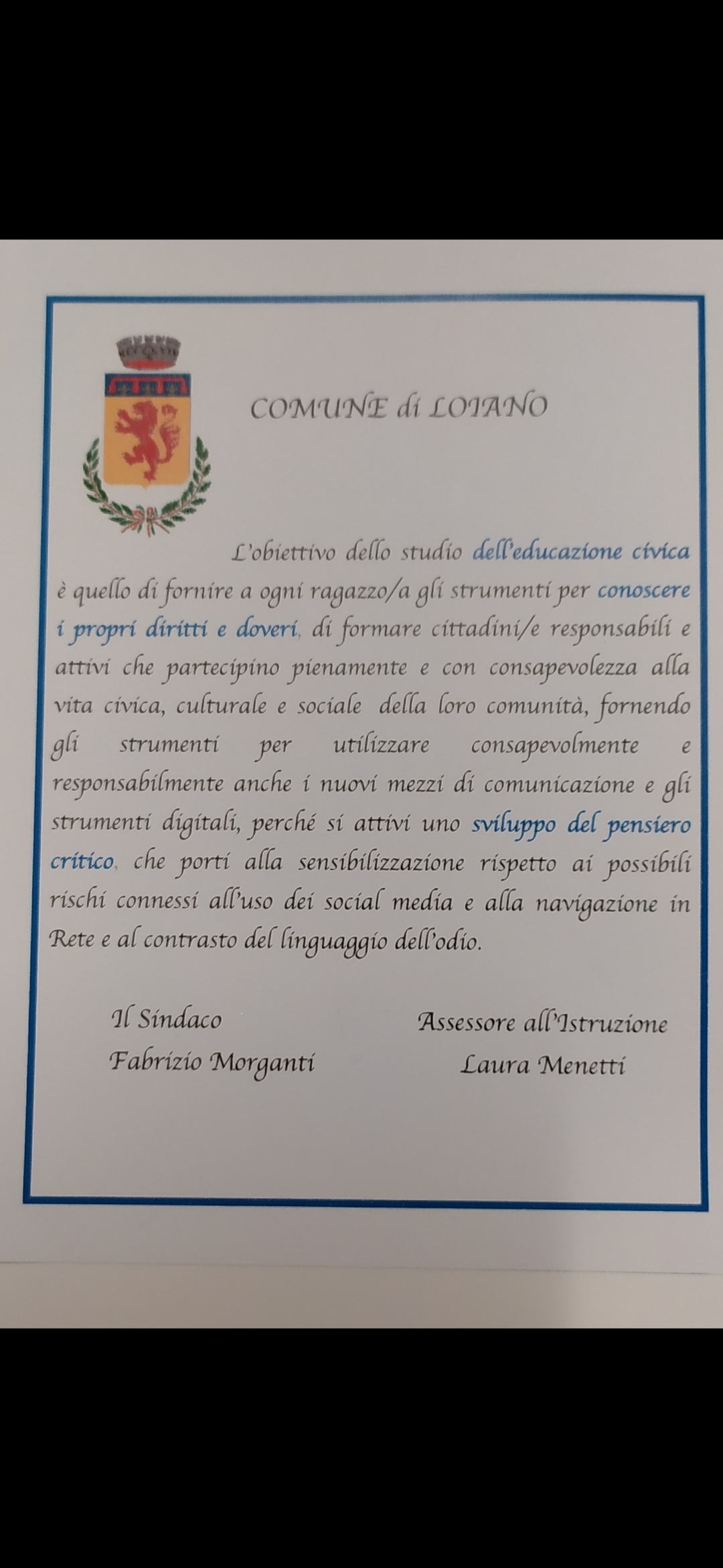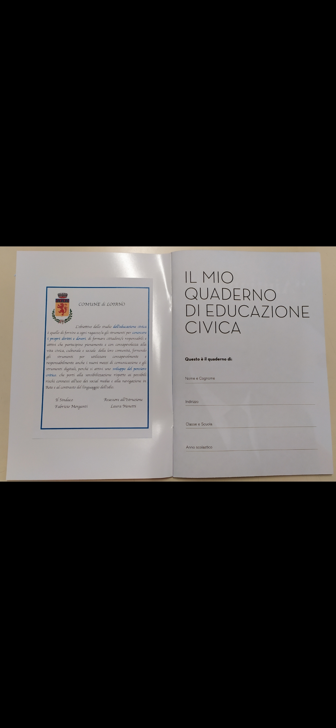 L'Amministrazione quest'anno ha donato ai ragazzi e alle ragazze delle medie di Loiano un libro improntato proprio sull'educazione civica, come ottimo spunto per studenti e docenti per trattare temi salienti come la Costituzione, la discriminazione di genere, la cura del pianeta, il Manifesto della comunicazione non ostile e molti altri.