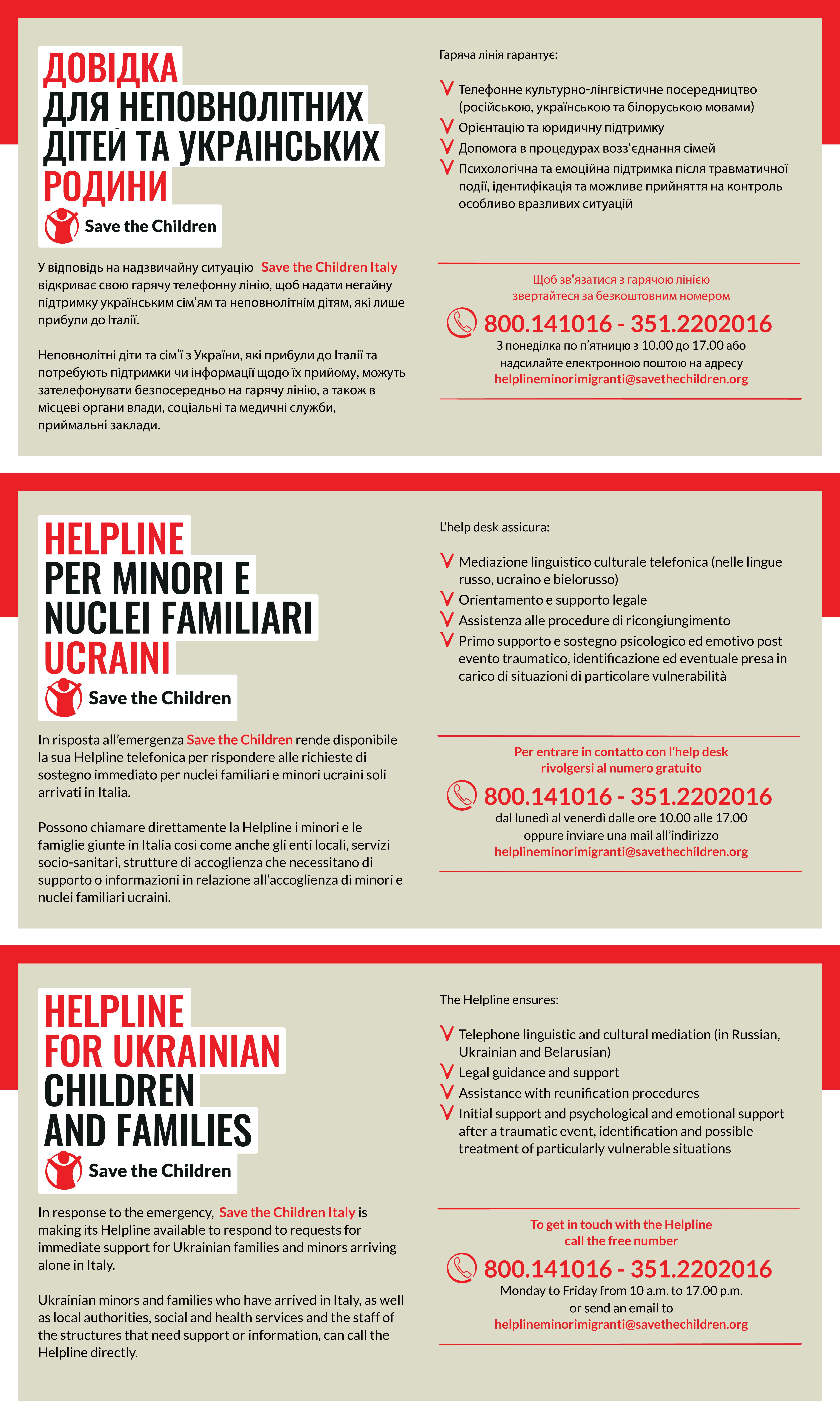 Save the Children Italia ha reso disponibile una Helpline telefonica per rispondere alle richieste di sostegno immediato per nuclei familiari e minori ucraini soli arrivati in Italia.