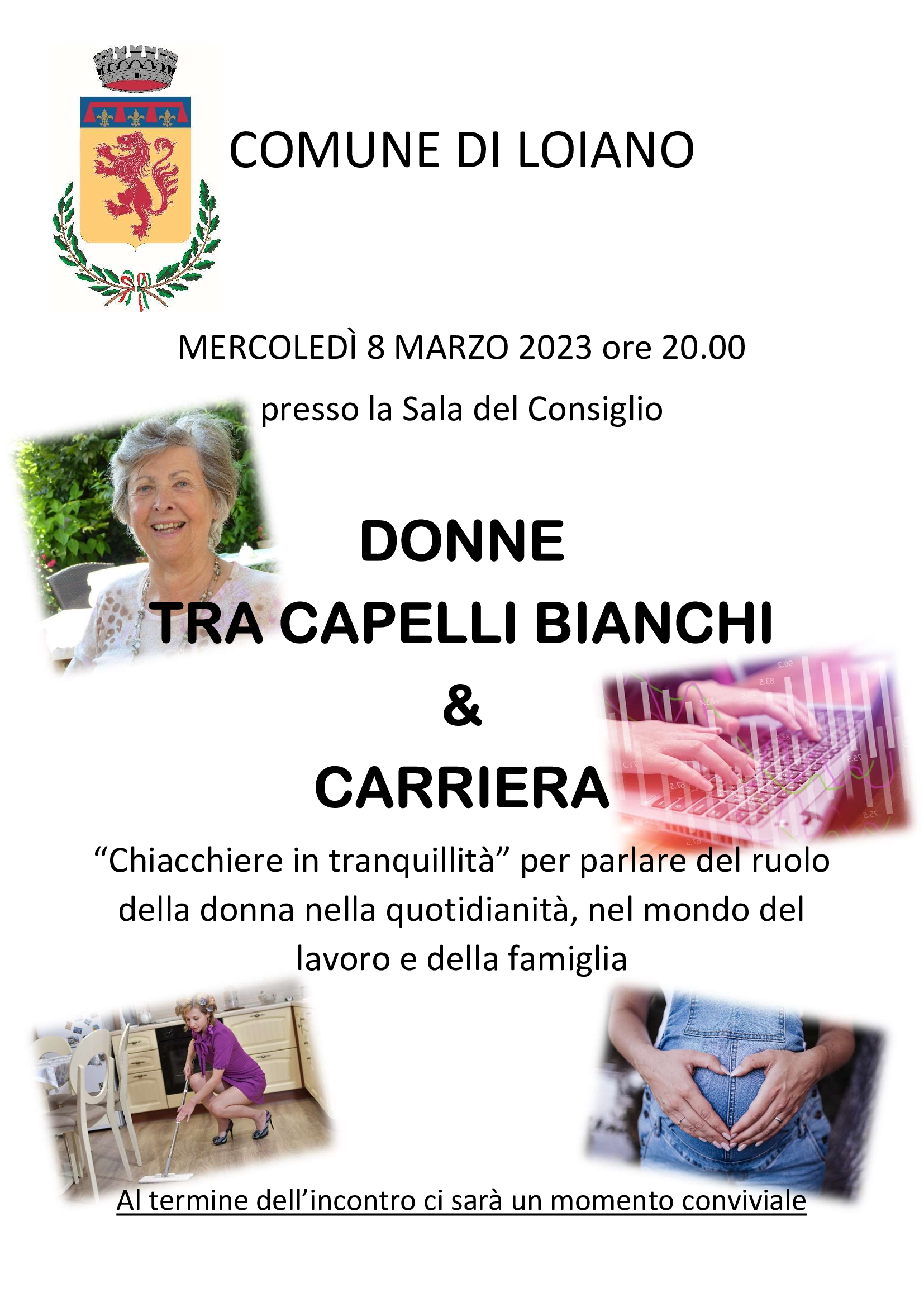 Il Comune di Loiano celebrerà l'8 marzo con l'iniziativa Donne tra capelli bianchi e carriera, una "chiacchierata in tranquillità" per discutere del ruolo della donna nella quotidianità e nel mondo del lavoro e della famiglia.