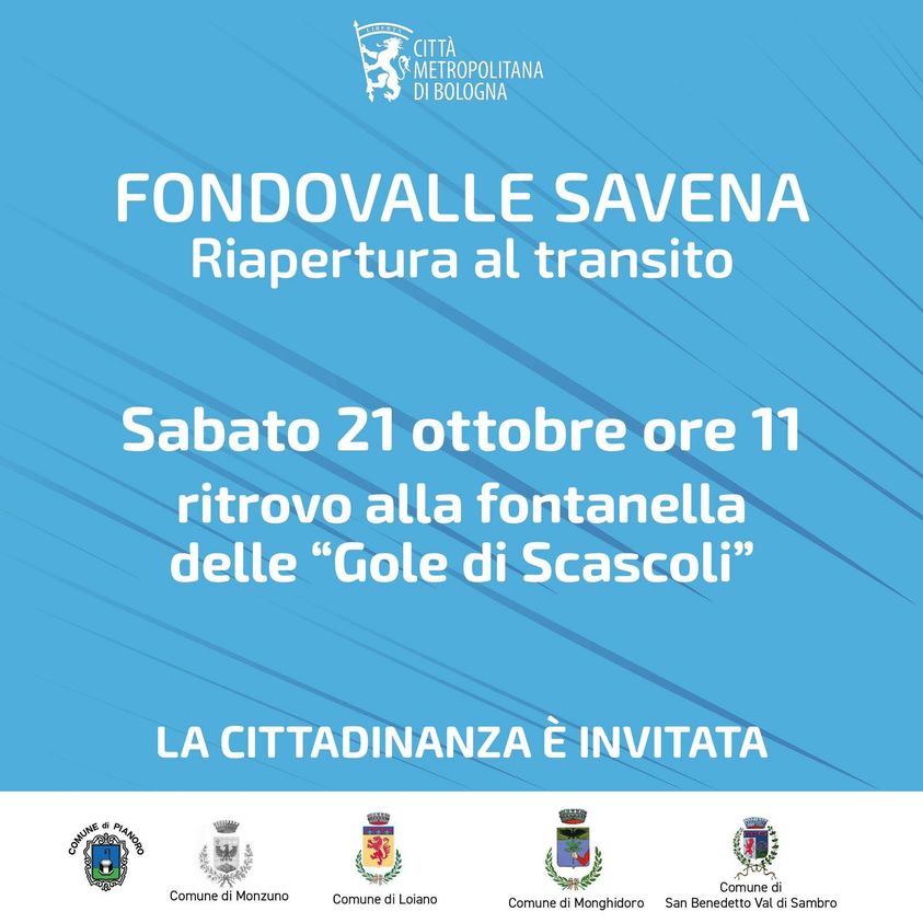 Si ricorda inoltre che sabato 21 ottobre 2023, alle ore 11, presso la Fontanella delle Gole di Scascoli, è prevista la cerimonia con taglio del nastro per la riapertura al transito della Fondovalle Savena.