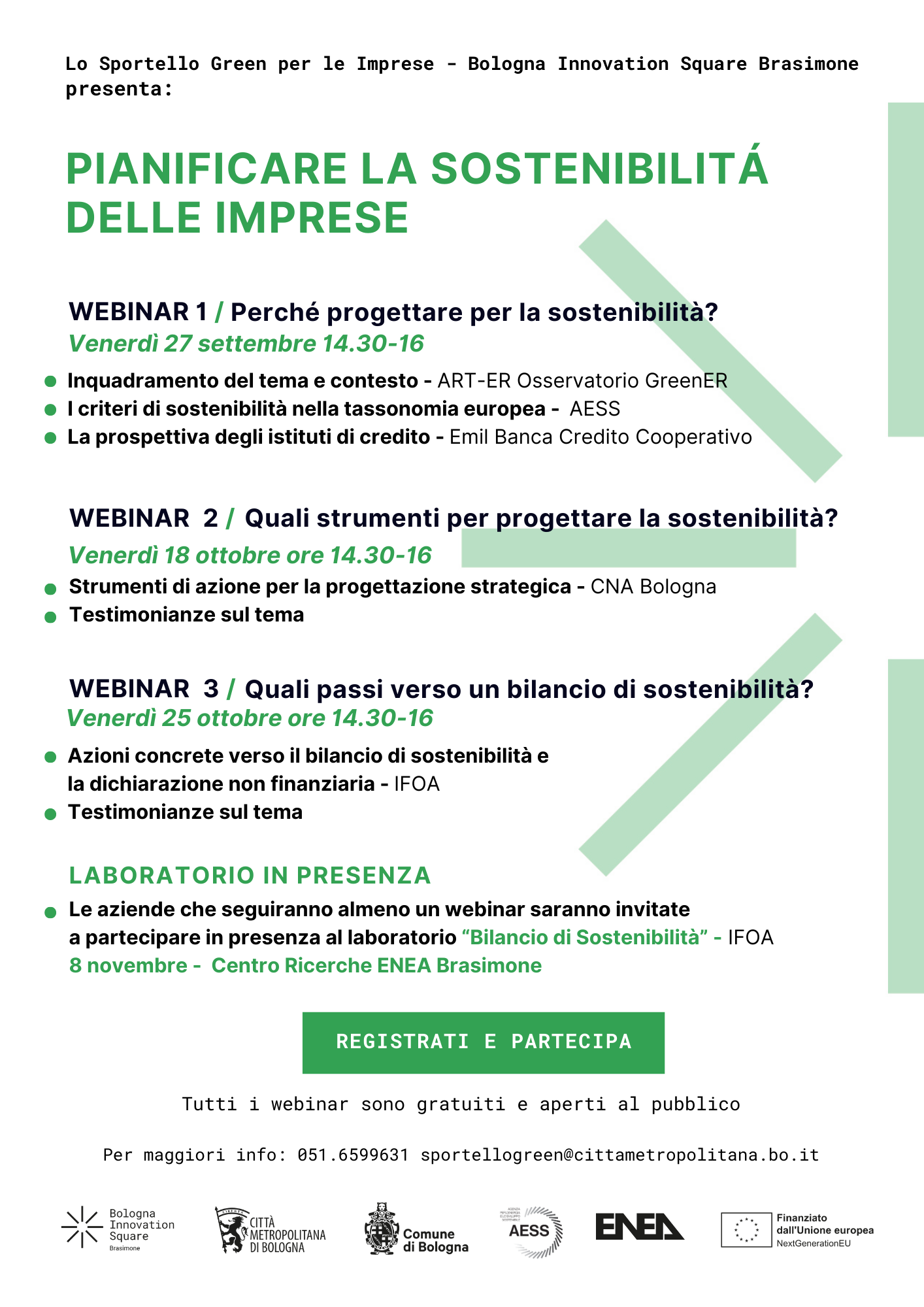 - venerdì 27 settembre 2024, ore 14.30-16.00: webinar “Perché progettare la sostenibilità?”;