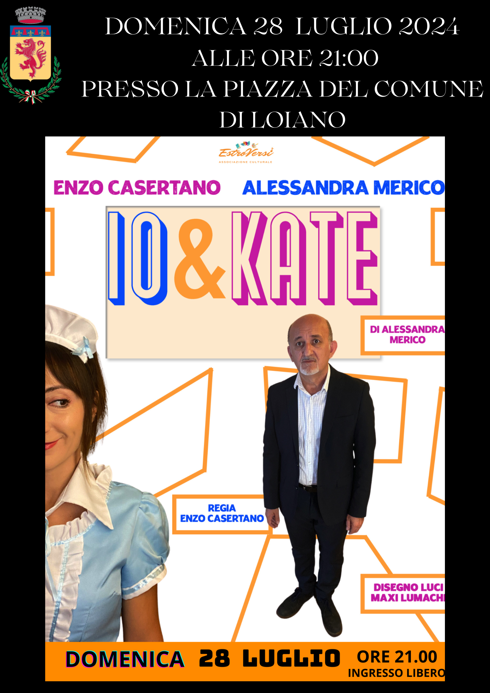 Domenica 28 luglio 2024, alle ore 21, presso la Piazza del Municipio del Comune di Loiano (Via Roma n.55), gli attori Enzo Casertano e Alessandra Merico porteranno in scena lo spettacolo teatrale "Io e Kate".