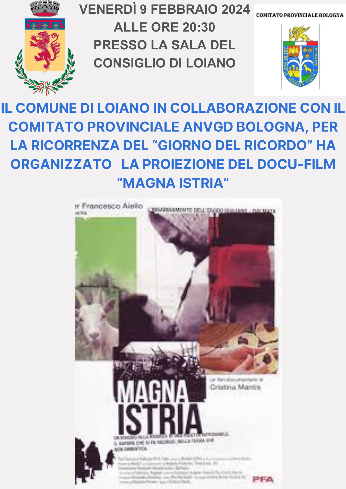 Il Comune di Loiano, in collaborazione con il Comitato provinciale ANVGD BOLOGNA, ha organizzato per venerdì 9 febbraio 2024, alle ore 20:30, presso la Sala del Consiglio del Municipio (Via Roma n.55), la proiezione del docu-film diretto da Cristina Mantis “Magna Istria”.