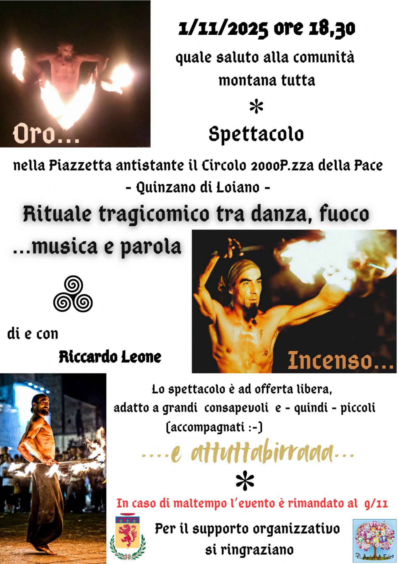 Sabato 1° novembre 2025, a Quinzano, in Piazza della Pace, si terrà lo spettacolo di mangiafuoco ideato e interpretato da Riccardo Leone.