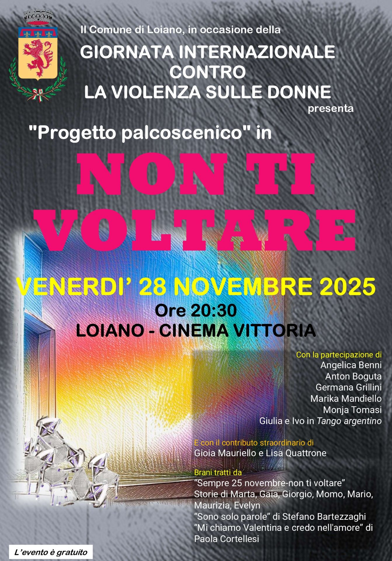 Nell'ambito delle iniziative organizzate per ricordare la Giornata internazionale per l'eliminazione della violenza contro le donne che si celebra il 25 novembre di ogni anno, venerdì 28 novembre 2025, alle ore 20:30, presso il Cinema Vittoria di Loiano (Via Roma n. 5) si terrà lo spettacolo "Non ti voltare".