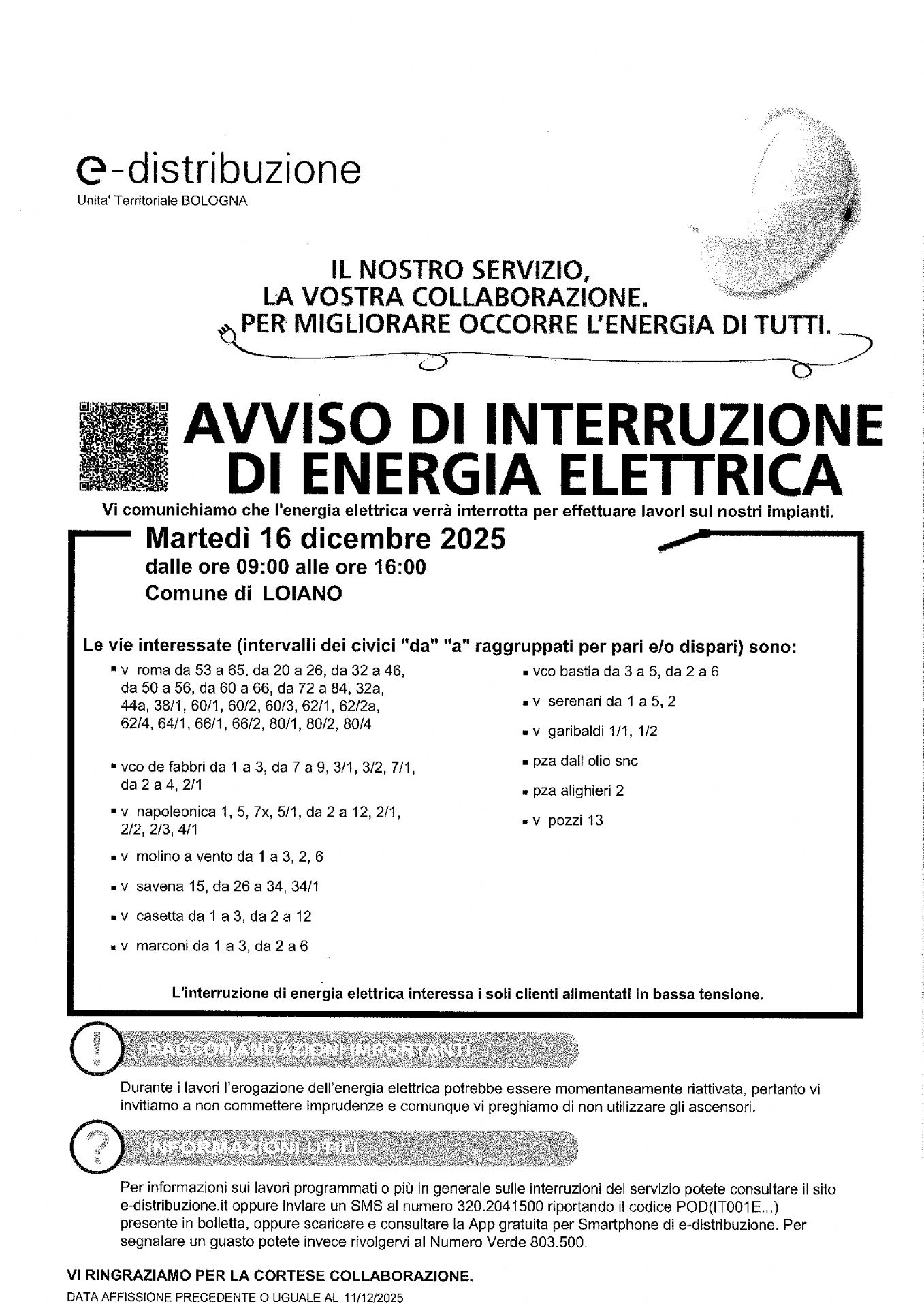Si comunica che nella giornata di martedì 16 dicembre 2025, dalle ore 09.00 alle ore 16:00, causa manutenzione sugli impianti, le vie elencate di seguito (intervalli dei civici "da" "a" raggruppati per pari e/o dispari) saranno interessate dall'interruzione dell'energia elettrica: