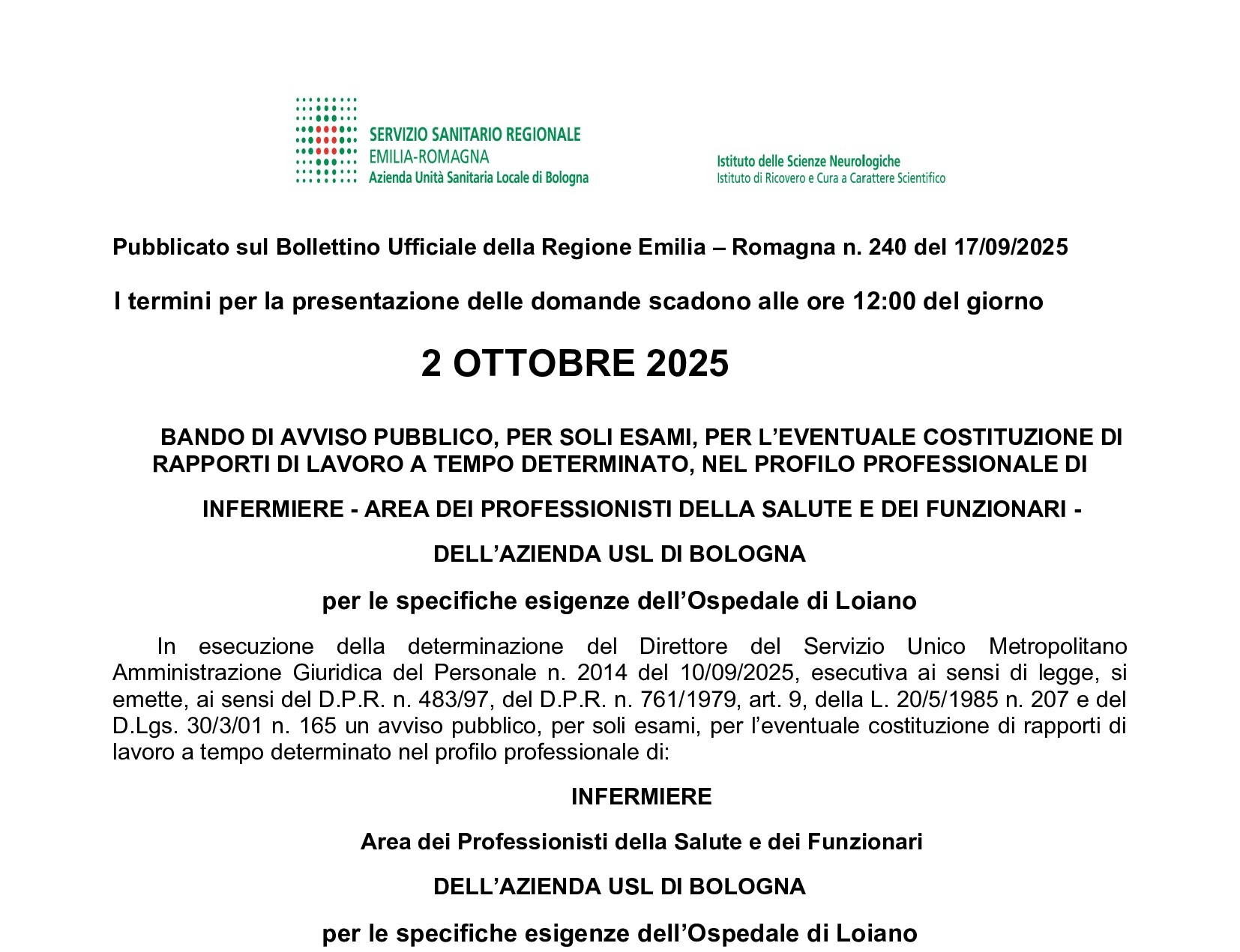 Si ricorda che fino alle ore 12:00 di giovedì 2 ottobre 2025 è possibile presentare domanda per partecipare all' avviso pubblico pubblicato dall'AUSL di Bologna per la costituzione di rapporti di lavoro a tempo determinato, nel profilo professionale di infermiere, per le specifiche esigenze dell’Ospedale di Loiano.