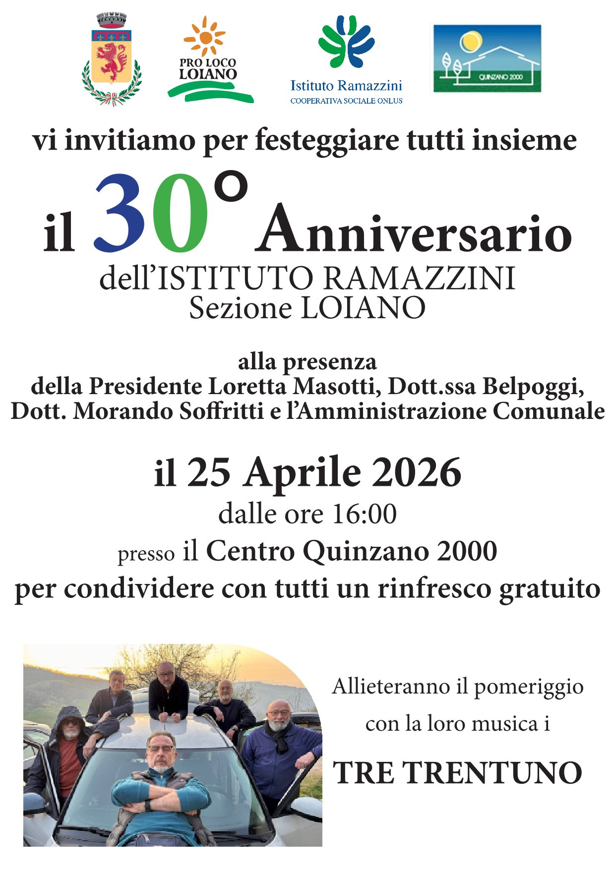Sabato 25 aprile 2026, dalle ore 16:00, presso il Centro Sociale Quinzano 2000 (in Piazza della Pace n.1, a Quinzano), si terranno i festeggiamenti per celebrare tutti insieme il 30° anniversario della fondazione della sezione di Loiano dell' Istituto Ramazzini, simbolo di solidarietà e attenzione verso il bene comune grazie all'impegno con cui promuove la cultura della prevenzione e della ricerca scientifica.