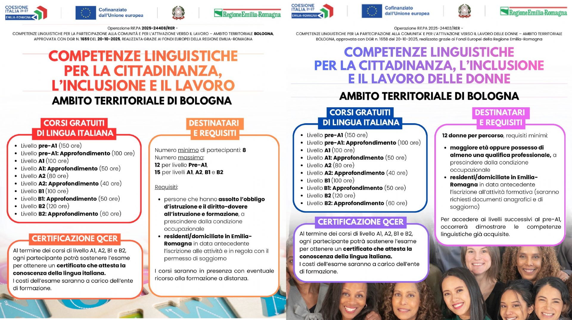 La Regione Emilia-Romagna finanzia corsi di italiano finanzia corsi gratuiti di lingua italiana (dal livello Pre-A1 sino al livello B2) rivolti a cittadini stranieri, per consentire l'acquisizione di competenze utili sia per la cittadinanza attiva, che per l'inclusione nel tessuto sociale e l'inserimento lavorativo.