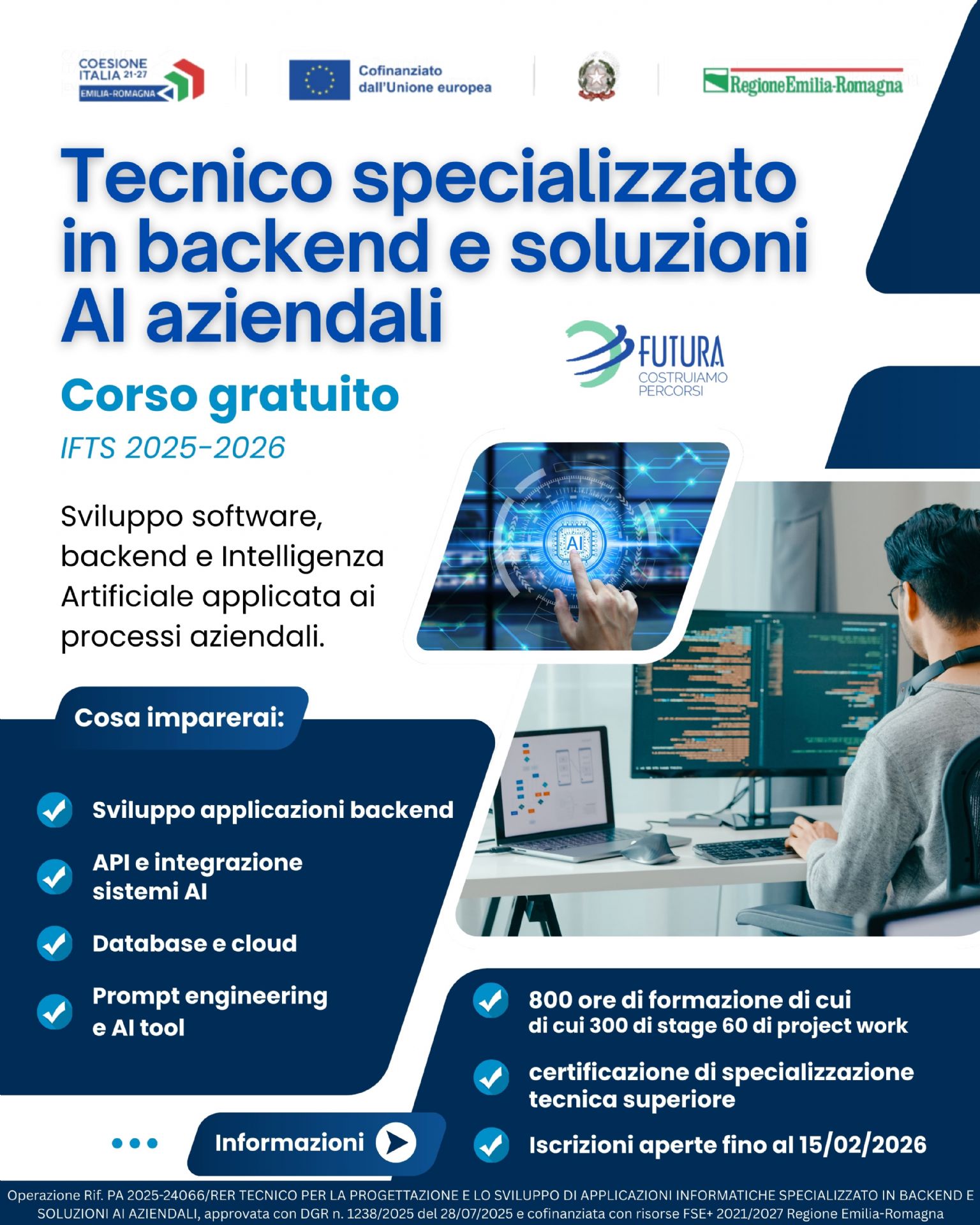 L'iniziativa, finanziata dal FSE e dalla Regione Emilia-Romagna, è gratuita e avrà una durata di 800 ore (di cui 440 ore in aula, 300 ore di stage e 60 di project work), in calendario da marzo 2026 a febbraio 2027.