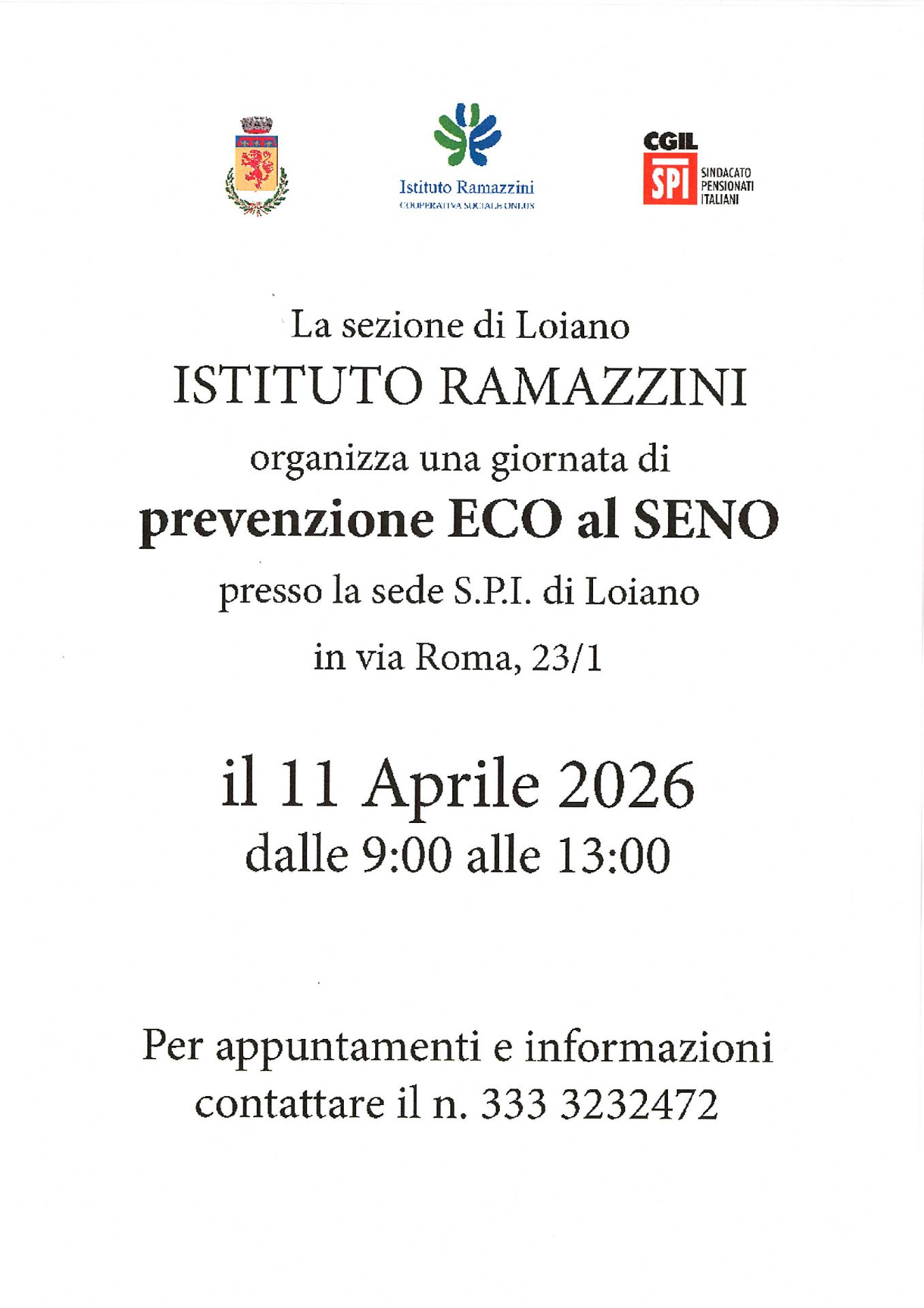Sabato 11 aprile 2026, dalle ore 9:00 alle ore 13:00, l'Istituto Ramazzini - sezione di Loiano organizza una giornata di prevenzione eco al seno, rivolta a tutta la cittadinanza.