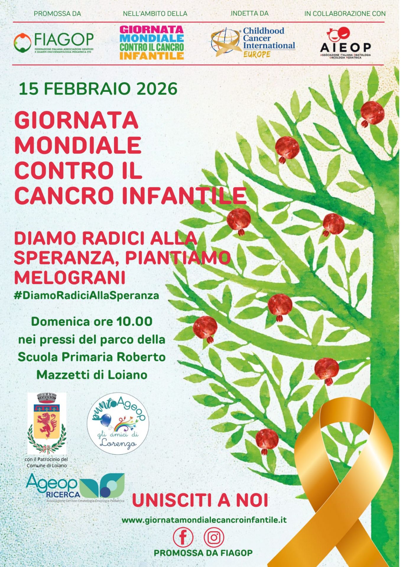 Domenica 15 febbraio 2026, in occasione della Giornata mondiale contro il cancro infantile, l'associazione Fiagop ETS (Federazione Italiana Associazioni Genitori e guariti oncoematologia pediatrica) promuove l'iniziativa "Diamo radici alla speranza, piantiamo melograni".