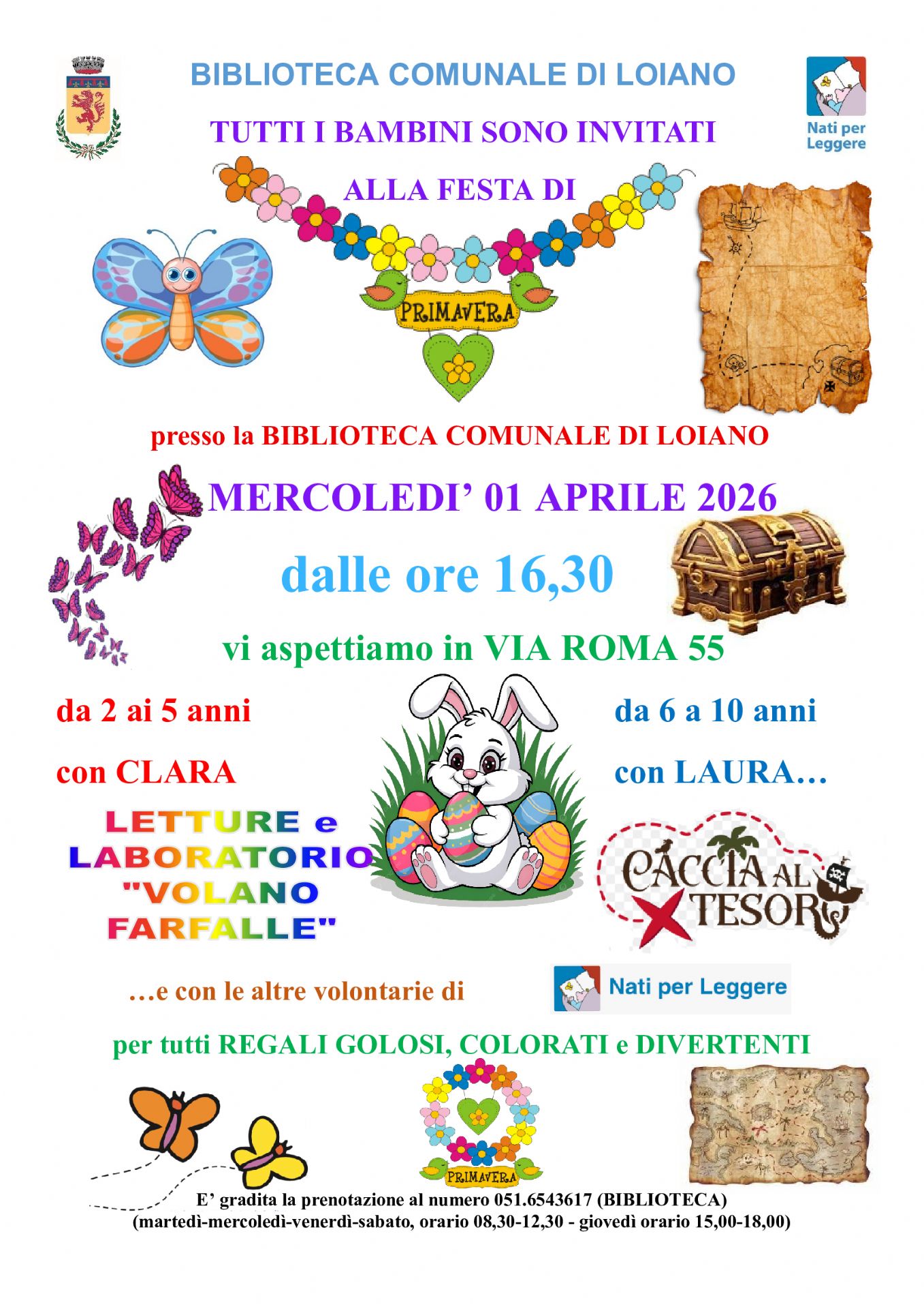 Mercoledì 1° aprile 2026, dalle ore 16:30, presso la Biblioteca del Comune di Loiano si terrà la Festa di Primavera, con tante letture, laboratori e creatività.