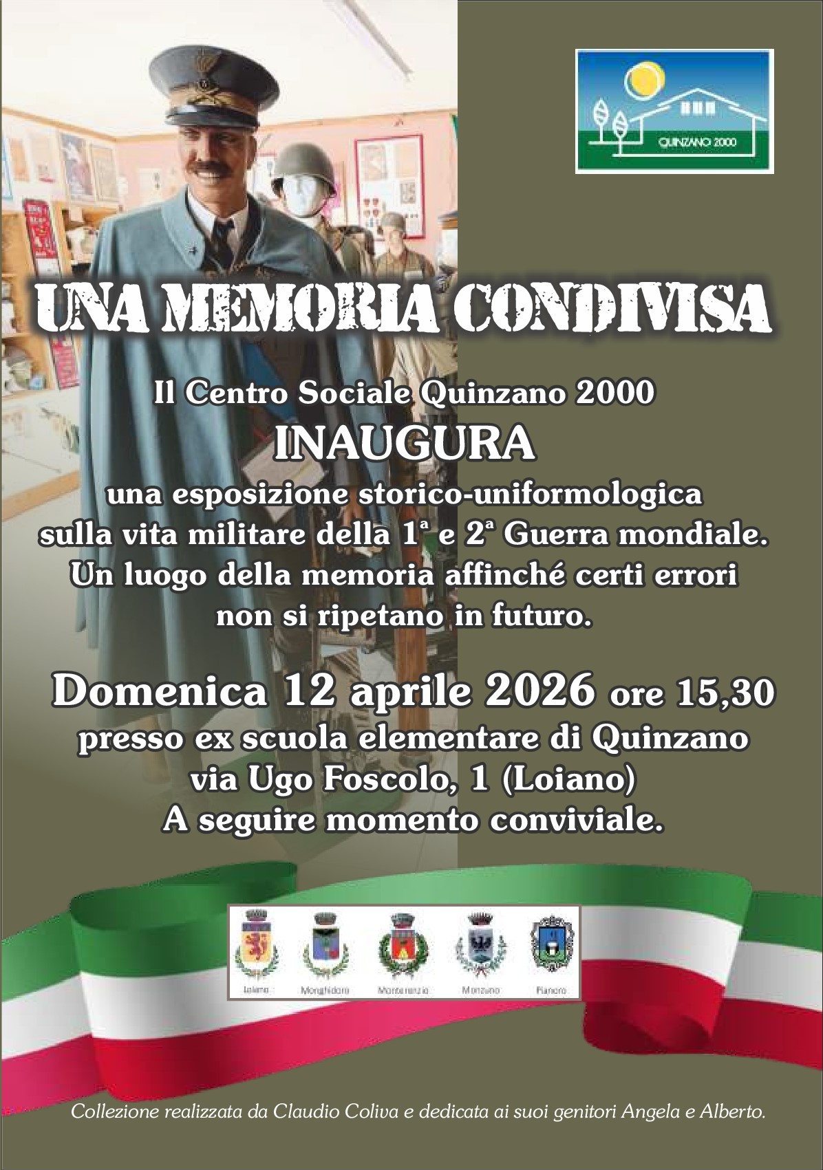 Domenica 12 aprile 2026, dalle ore 15:30, presso l'ex scuola elementare di Quinzano (via Ugo Foscolo n.1), si terrà l'inaugurazione dell' esposizione storico-uniformologica "Una memoria condivisa", dedicata alla vita militare della Prima e...