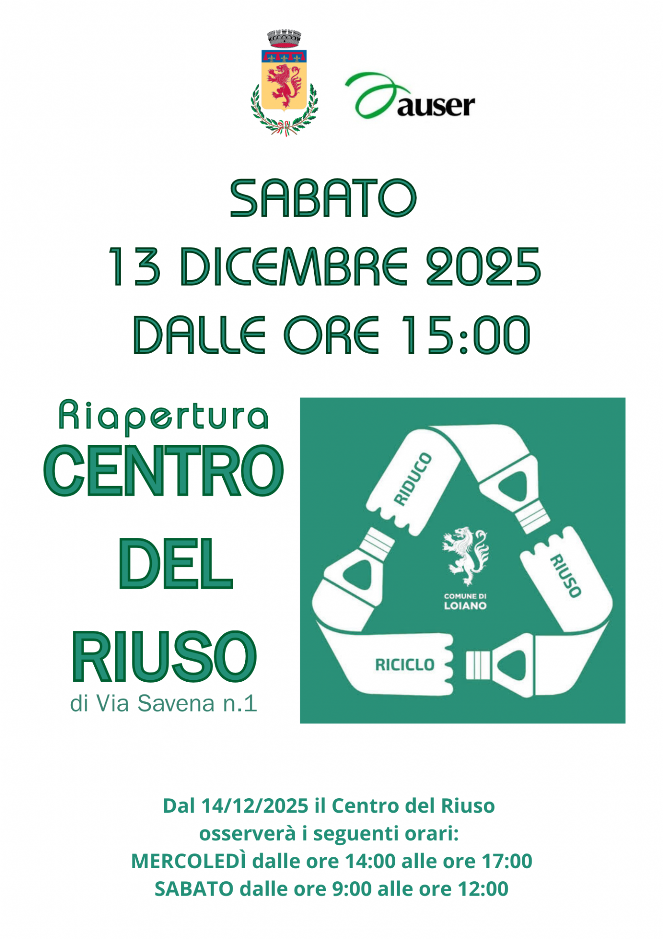 Dal 14/12/2025 il Centro del Riuso osserverà i seguenti orari di apertura: