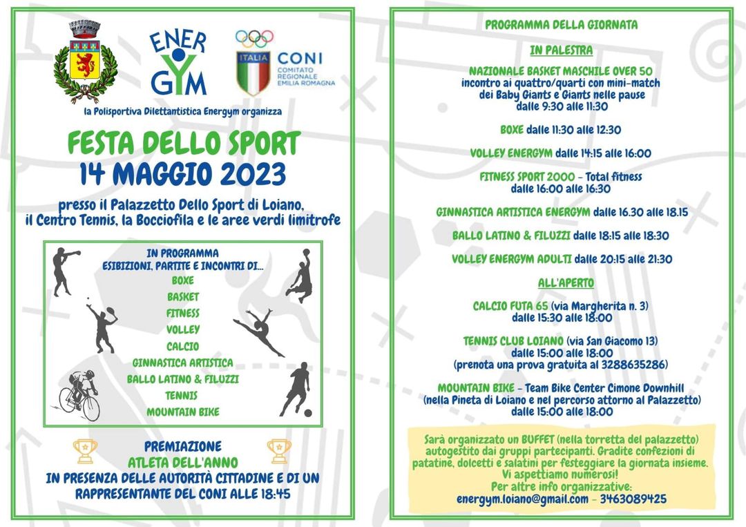 Domenica 14 maggio 2023 la Polisportiva dilettantistica Energym, con il patrocinio e il supporto del Comune di Loiano e del CONI, organizza la Festa dello Sport.
