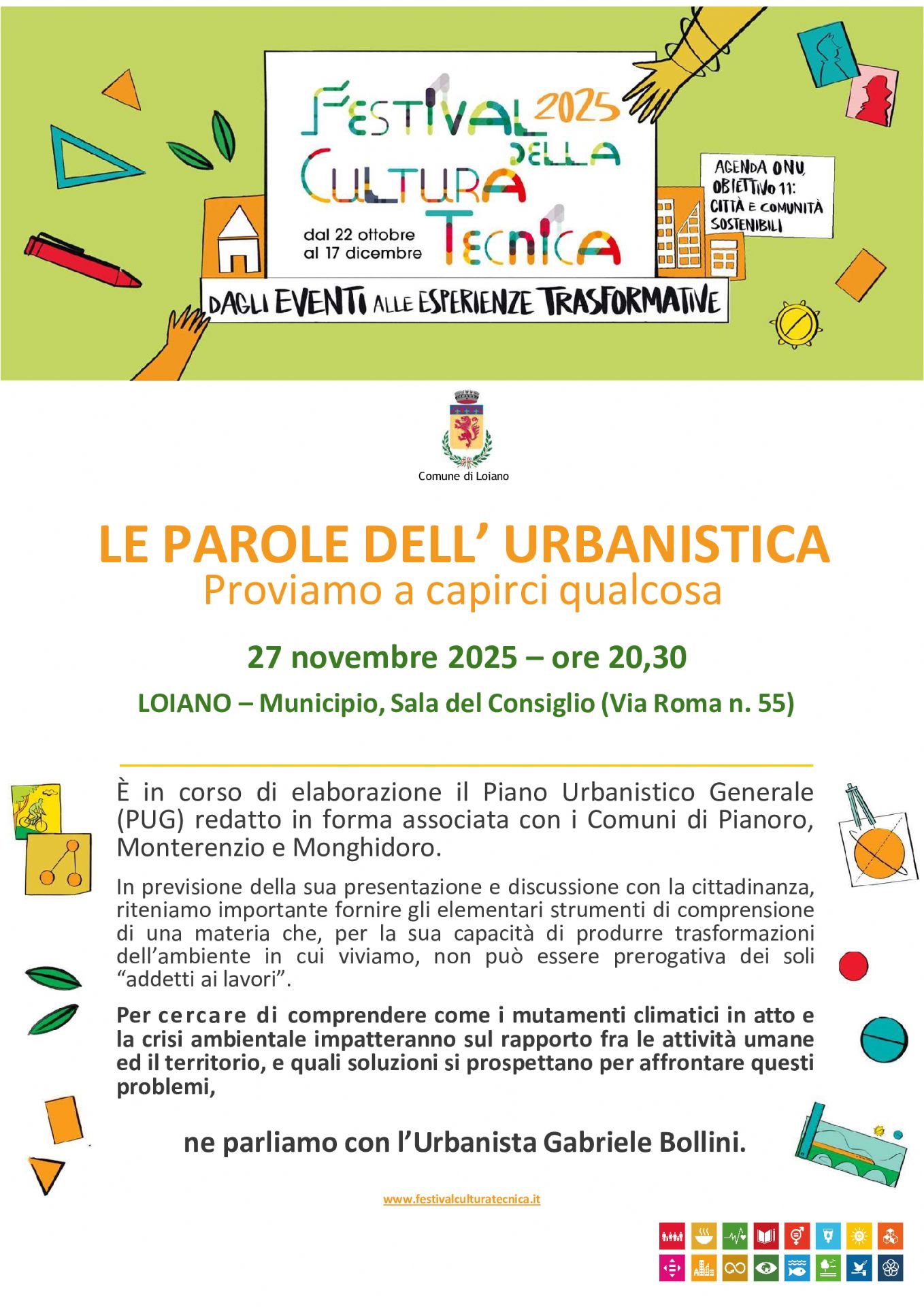 Nell'ambito degli eventi in calendario, il Comune di Loiano organizza il secondo incontro del ciclo "Le parole dell'urbanistica. Proviamo a capirci qualcosa", che si terrà giovedì 27 novembre 2025, a partire dalle ore 20:30, presso al Sala del Consiglio del Municipio (Via Roma n. 55).