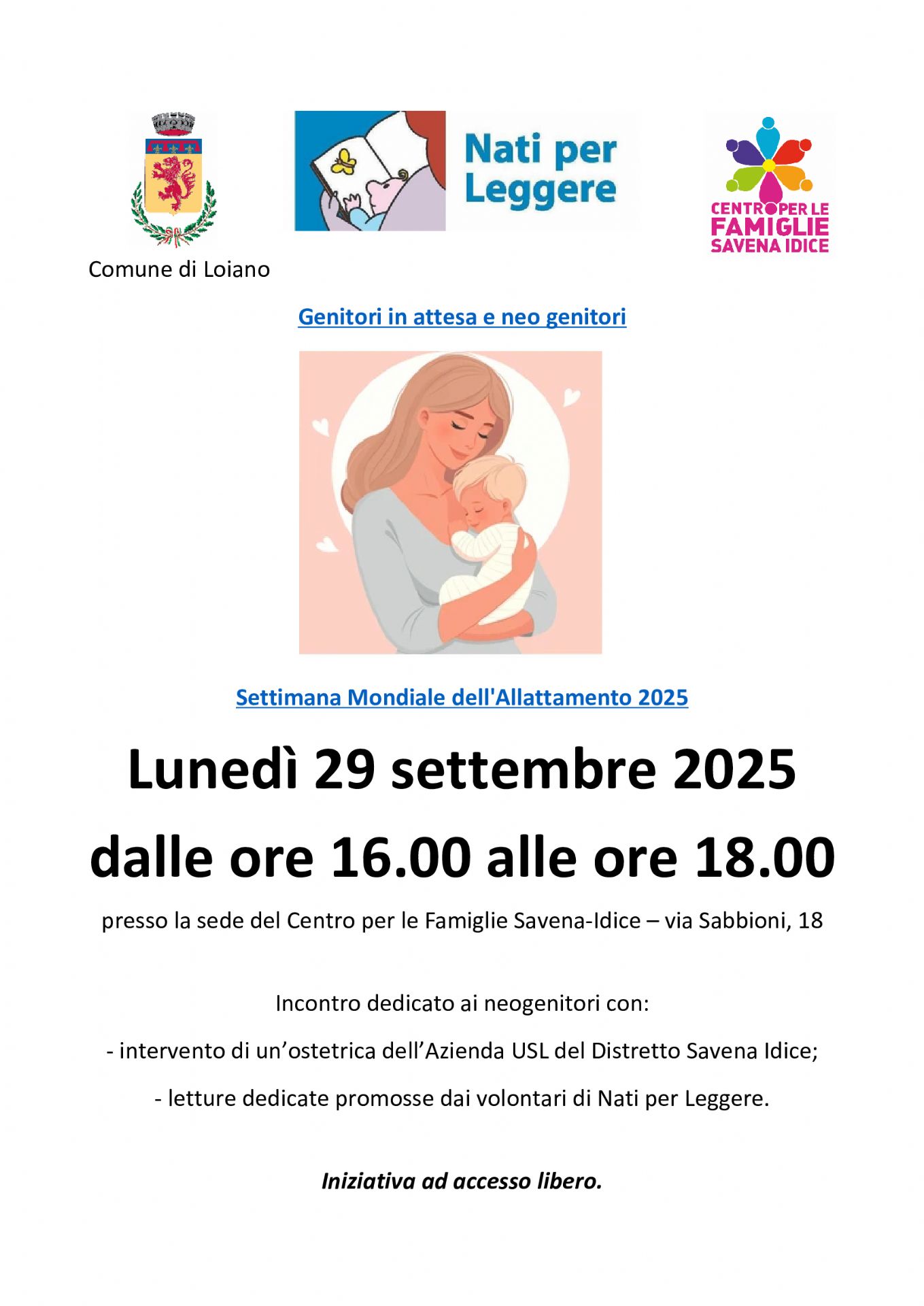 L'iniziativa è rivolta a tutti i neogenitori e prevede l'intervento di un’ostetrica dell’Azienda USL del Distretto Savena Idice e una serie di letture dedicate, promosse dai volontari di Nati per Leggere.