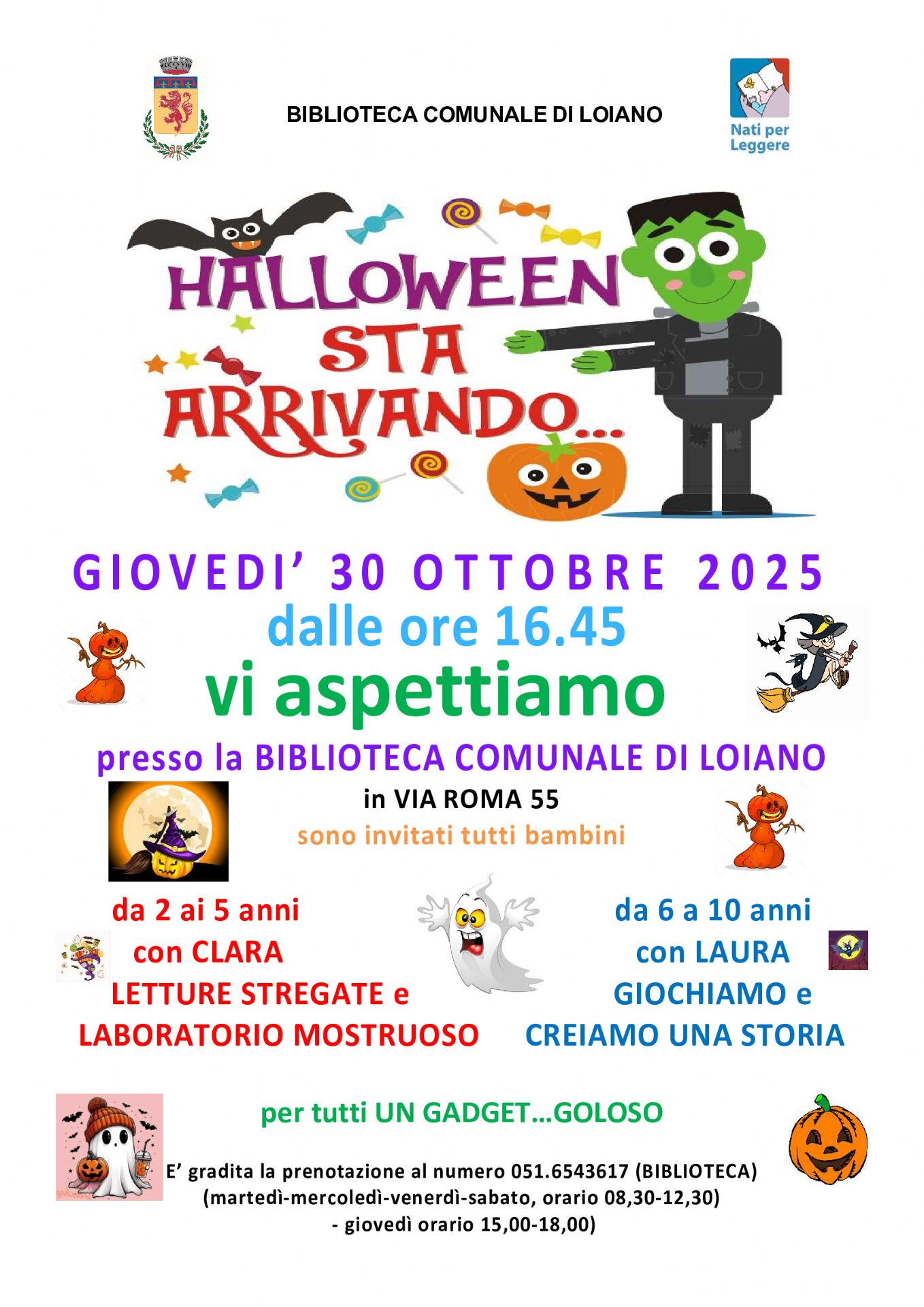 Giovedì 30 ottobre 2025, dalle ore 16:45, presso la Biblioteca del Comune di Loiano si terrà l'iniziativa "Halloween sta arrivando", con letture animate, giochi e tanta mostruosa creatività.