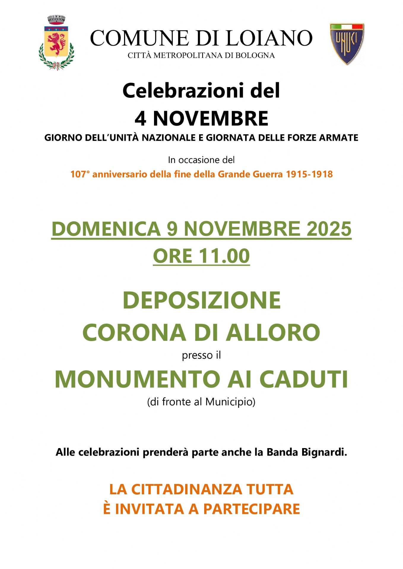 Domenica 9 novembre 2025, alle ore 11, presso il Monumento ai Caduti (di fronte al Municipio), si terranno le celebrazioni per onorare la ricorrenza del 4 novembre, giorno dell'Unità nazionale e giornata delle Forze Armate.