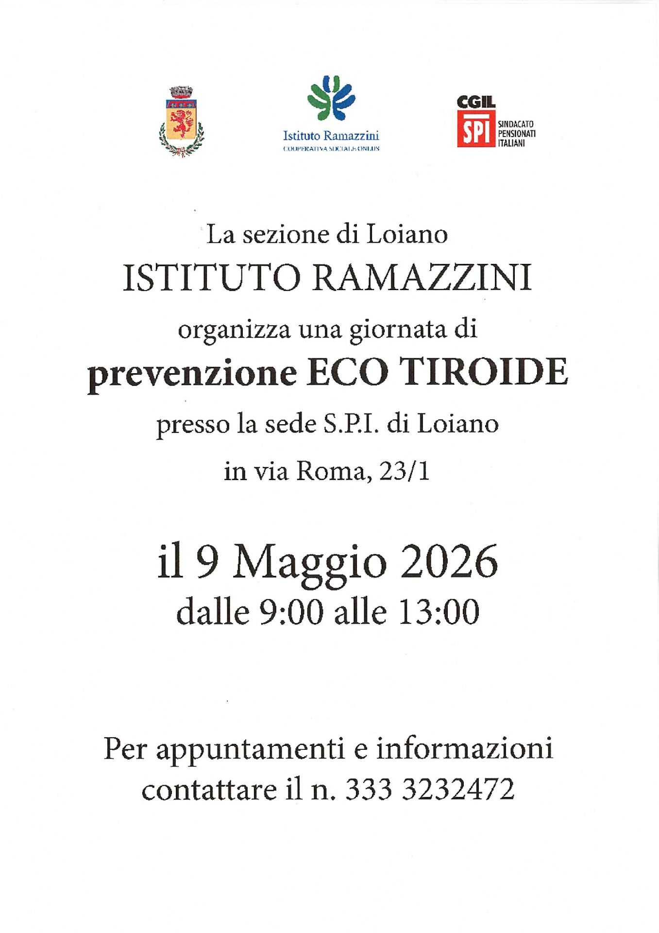 Sabato 9 maggio 2026, dalle ore 9:00 alle ore 13:00, l'Istituto Ramazzini - sezione di Loiano organizza una giornata di prevenzione eco-tiroide, rivolta a tutta la cittadinanza.