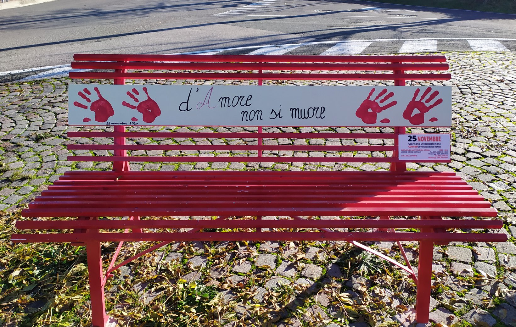 Un grande dono ci è stato fatto quest'anno da parte di una nostra giovane concittadina, che in prima persona ha vissuto sulla sua pelle questa terribile esperienza; ha voluto donarci due targhette che riportano i numeri utili e di emergenza a sostegno delle donne che subiscono violenza, da apporre sulle panchine rosse del nostro comune. Questi numeri si possono usare in ogni momento e a volte è sufficiente un semplice messaggio per essere aiutate.