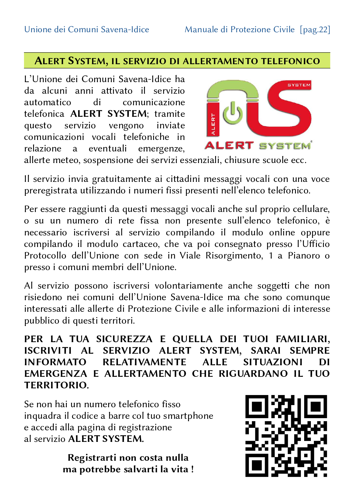 In occasione dell'incontro tenutosi in data 13/10/2022 per la presentazione dell'opuscolo “Manuale di Protezione Civile per la popolazione dell'Unione dei Comuni Savena–Idice", oltre a discutere i progetti che saranno attivati per potenziare le strutture della Protezione Civile presenti sul territorio dell'Unione Savena-Idice, è stata ribadita l'importanza del servizio telefonico di Alert System.