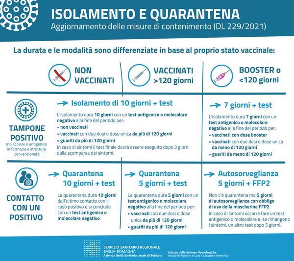 Per quanto riguarda quarantena e isolamento le modalità e la durata sono differenziate in base al proprio stato vaccinale. Per chi ha già effettuato la dose "booster" e per chi è guarito o ha completato il ciclo vaccinale primario da meno di 120 giorni: isolamento di 7 giorni in caso di positività e 5 giorni di autosorveglianza, senza quarantena, in caso di contatto con persona positiva.