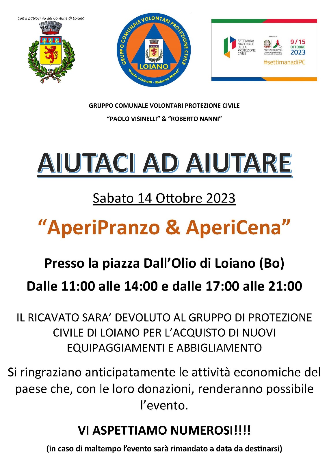 In occasione della settimana della Protezione Civile e della prevenzione dei rischi (9-15 ottobre 2023), il Gruppo Comunale Volontari Protezione Civile "Paolo Visinelli e Roberto Nanni" di Loiano organizza l'iniziativa Aiutaci ad aiutare - AperiPranzo e AperiCena.