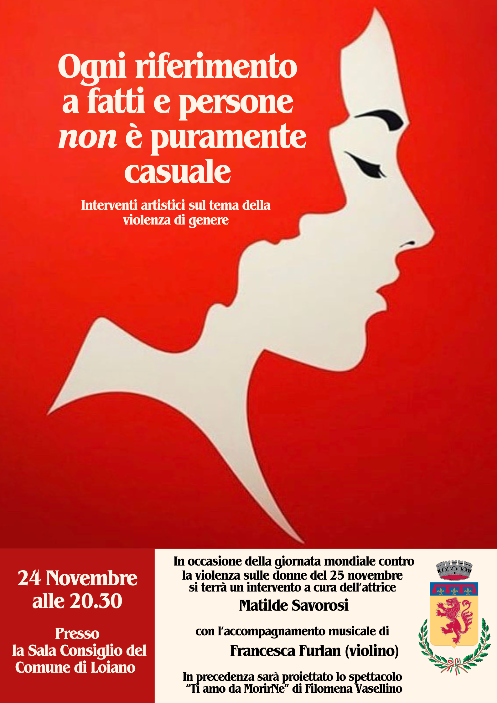 La serata prevede la proiezione dello spettacolo "Ti amo da morirNe" di Filomena Vasellino, a cui seguirà anche un intervento di Matilde Savorosi, attrice, con accompagnamento musicale della violinista Francesca Furlan e della pianista Elena Quattromini.
