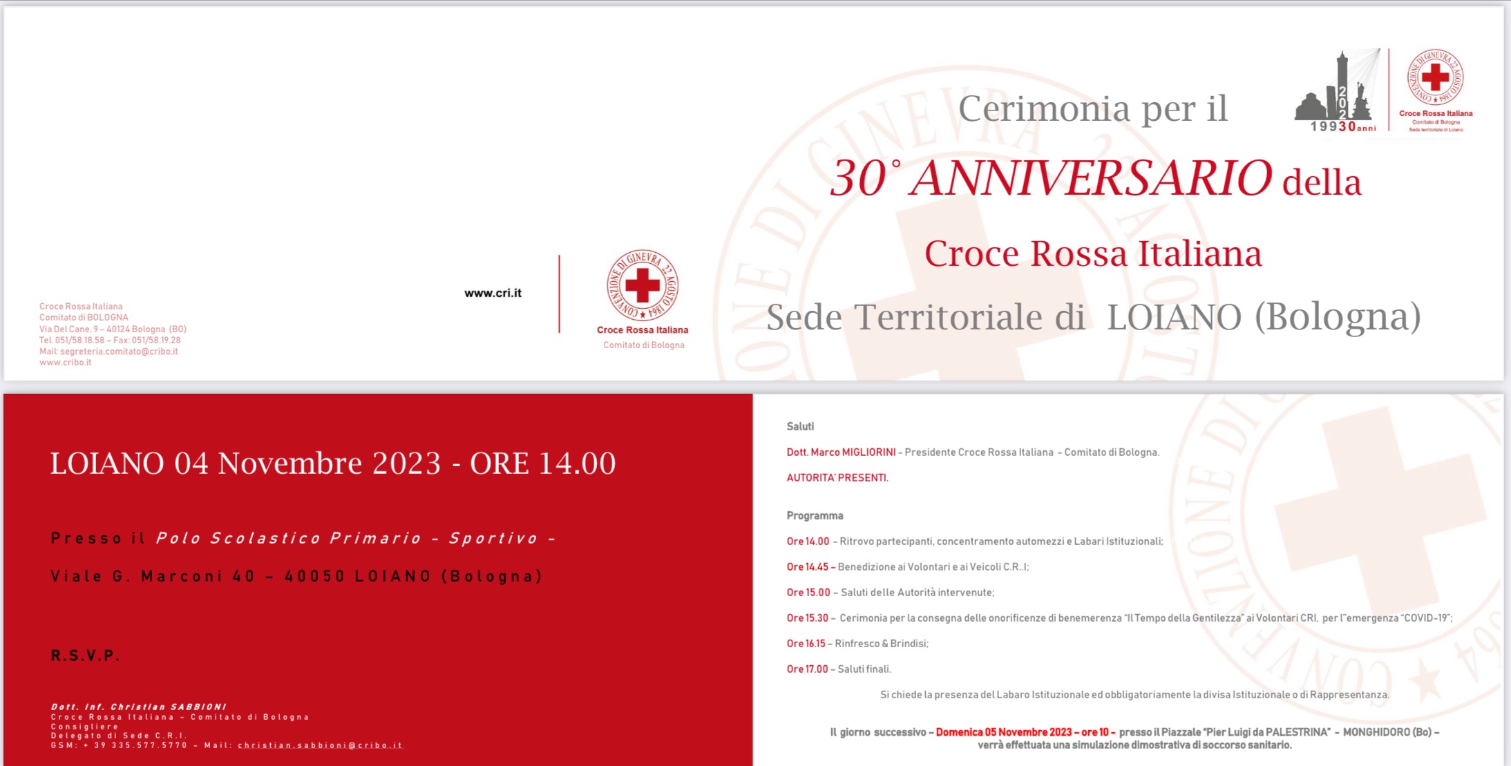 Sabato 4 novembre 2023, presso il Polo Scolastico Primario - Sportivo (Viale Marconi n. 40), si terrà la cerimonia per celebrare il 30° Anniversario della fondazione della Croce Rossa Italiana - Sede Territoriale di Loiano.