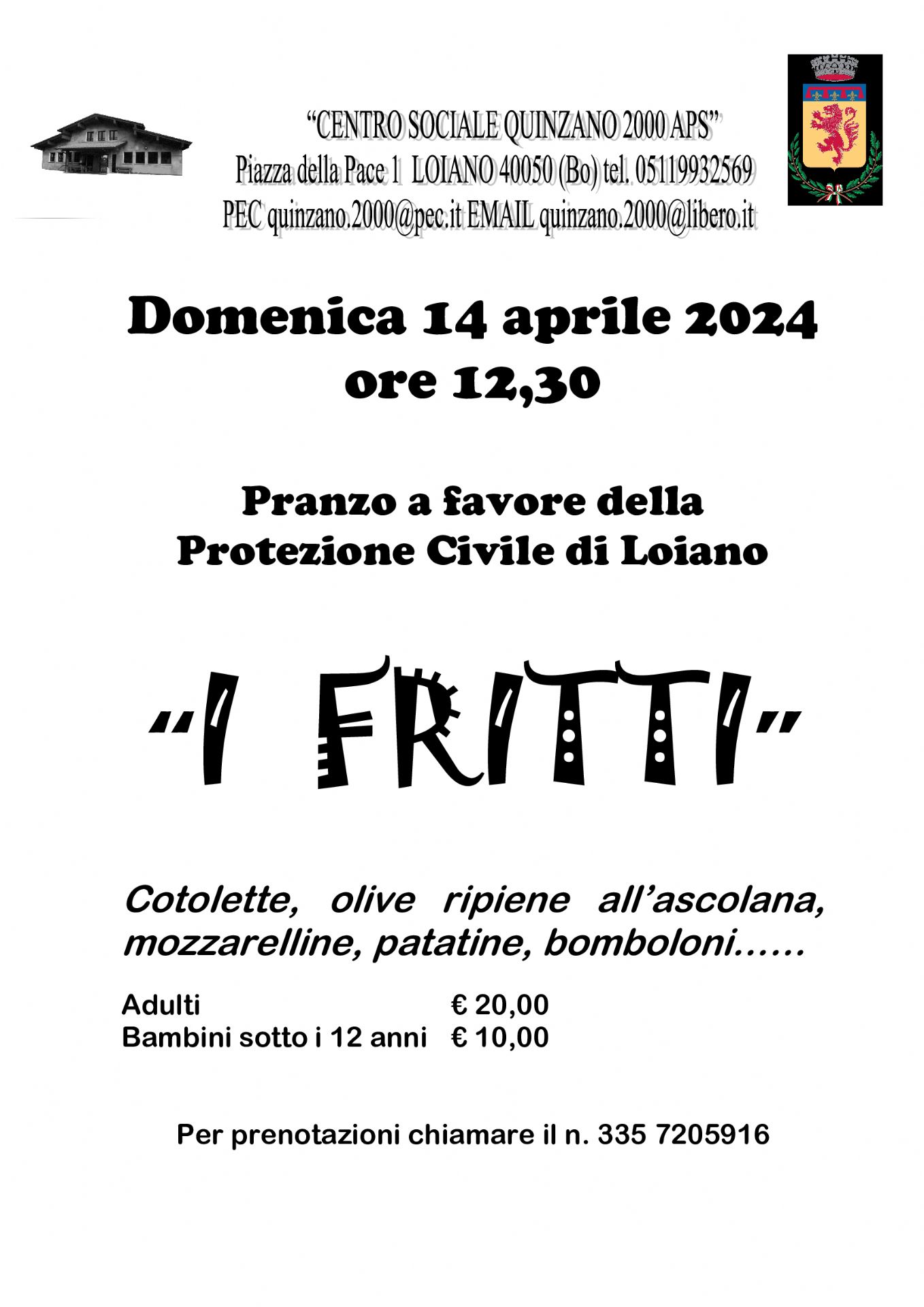 Il Centro Sociale Quinzano 2000 organizza "I Fritti", un pranzo a favore del Gruppo Comunale di Protezione Civile “Paolo Visinelli - Roberto Nanni”.