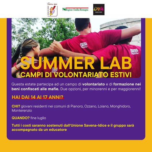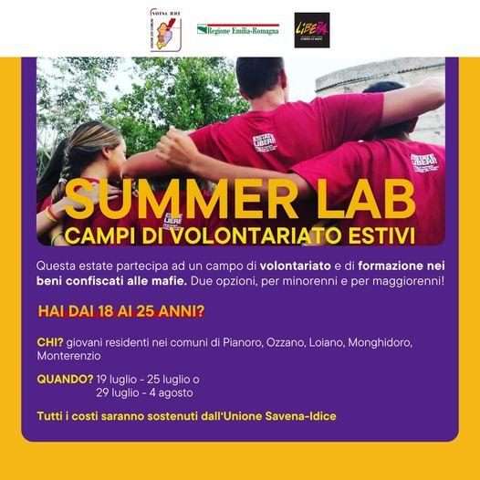 L'Unione dei Comuni Savena-Idice promuove i campi di volontariato estivi (summer lab) relativi al progetto "E!state liberi", un percorso di impegno e formazione nei terreni confiscati alle mafie organizzato dall’Associazione Libera contro le mafie.