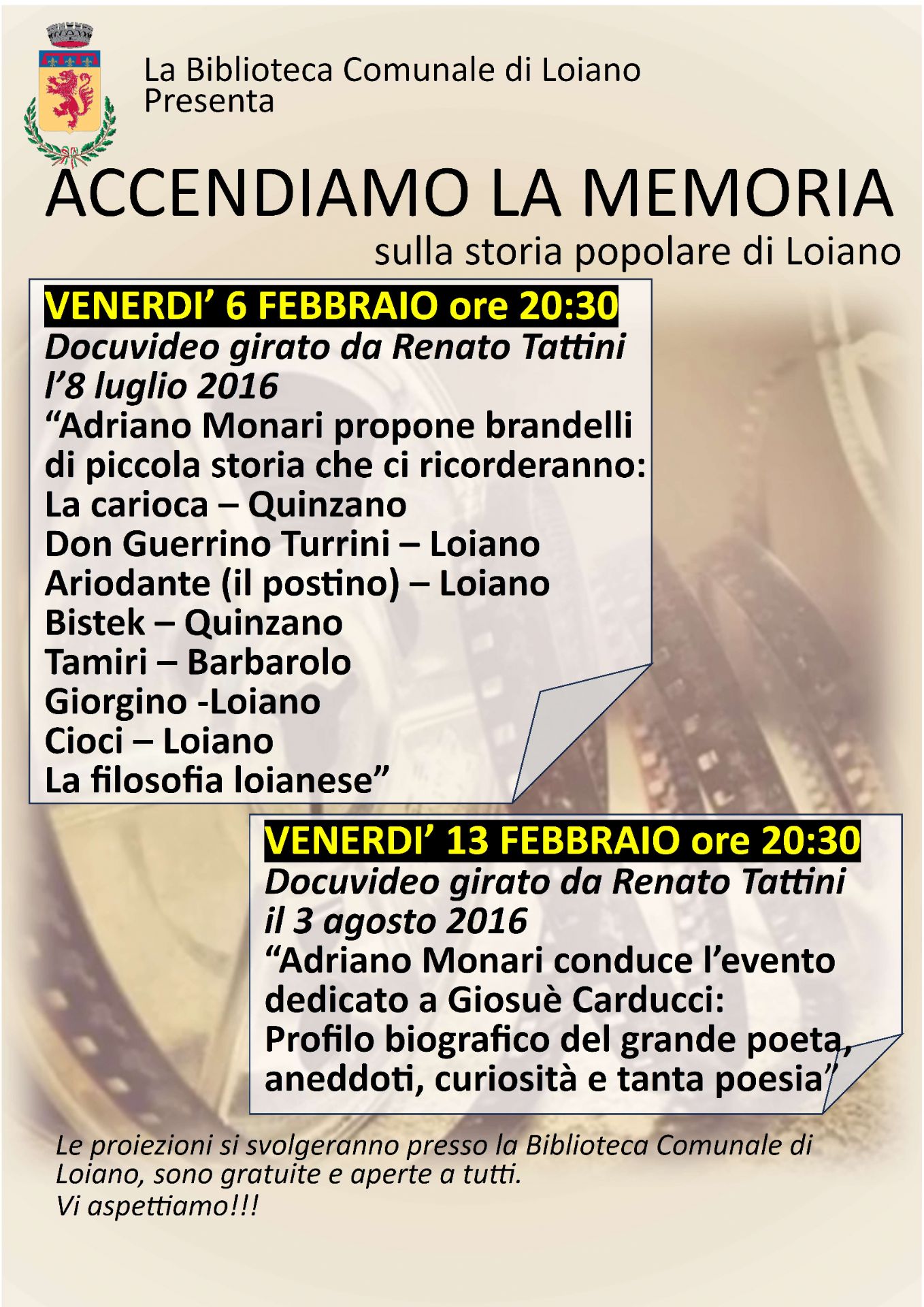 In occasione del secondo appuntamento, il 13/02/2026, verrà invece proiettato il docuvideo girato da Renato Tattini nell'agosto 2016, nel quale è possibile vedere Adriano Monari condurre l'evento dedicato a Giosuè Carducci: profilo biografico del grande poeta, aneddoti, curiosità e tanta poesia.