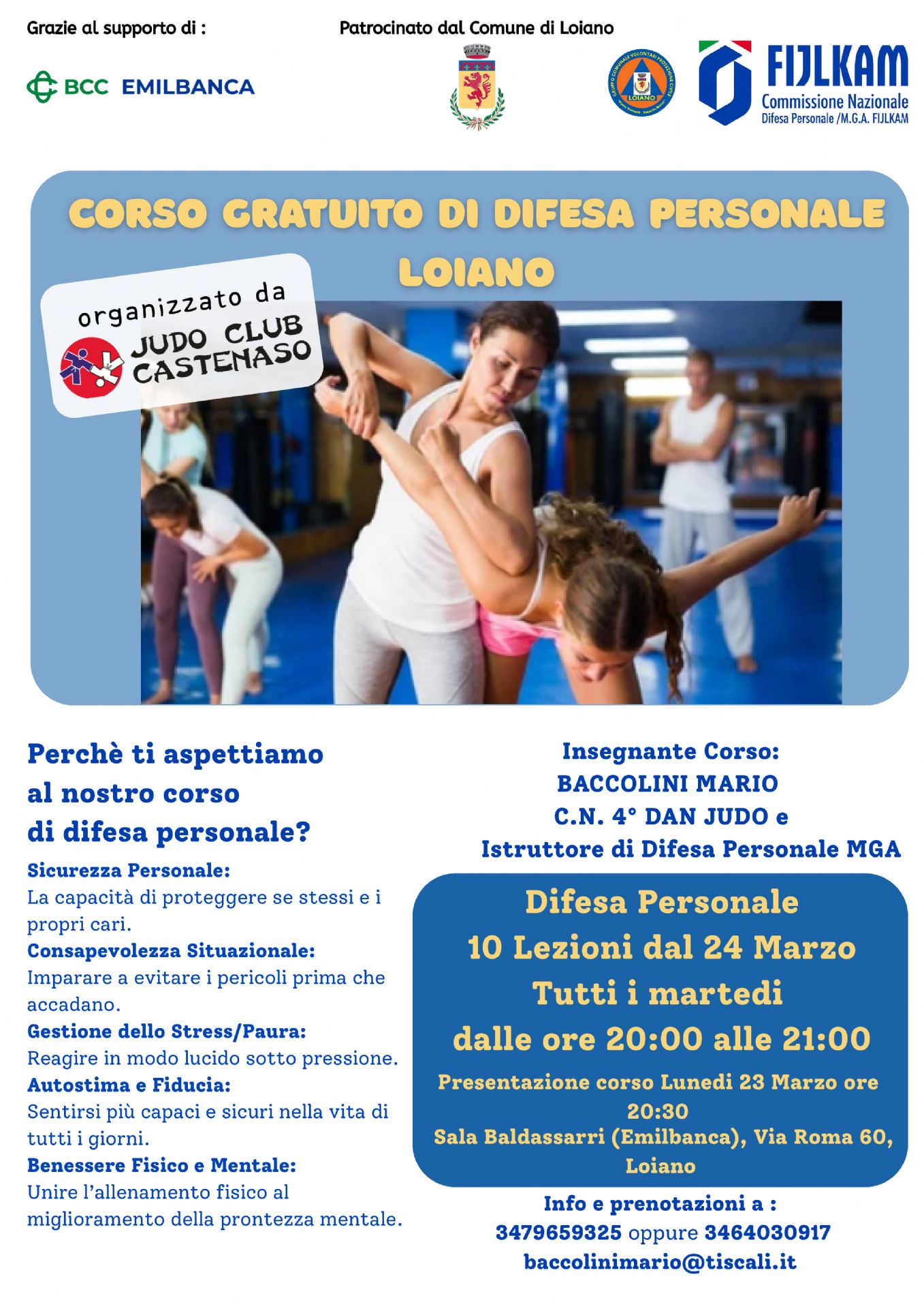 Martedì 24 marzo 2026, presso la Sala Baldassarri (Via Roma n. 60), prenderà avvio un corso di difesa personale gratuito, organizzato dall'ASD Judo Club Castenaso con il patrocinio del Comune di Loiano.