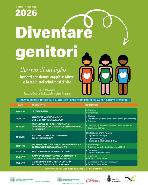Riprende anche nel primo semestre 2026 "Diventare genitori", un ciclo di 8 incontri gratuiti rivolto a donne e coppie in attesa di un figlio o con bambini nei primi mesi di vita, organizzato dall' Azienda USL di Bologna, in collaborazione con IRCCS Policlinico Sant’Orsola e Biblioteca SalaBorsa.