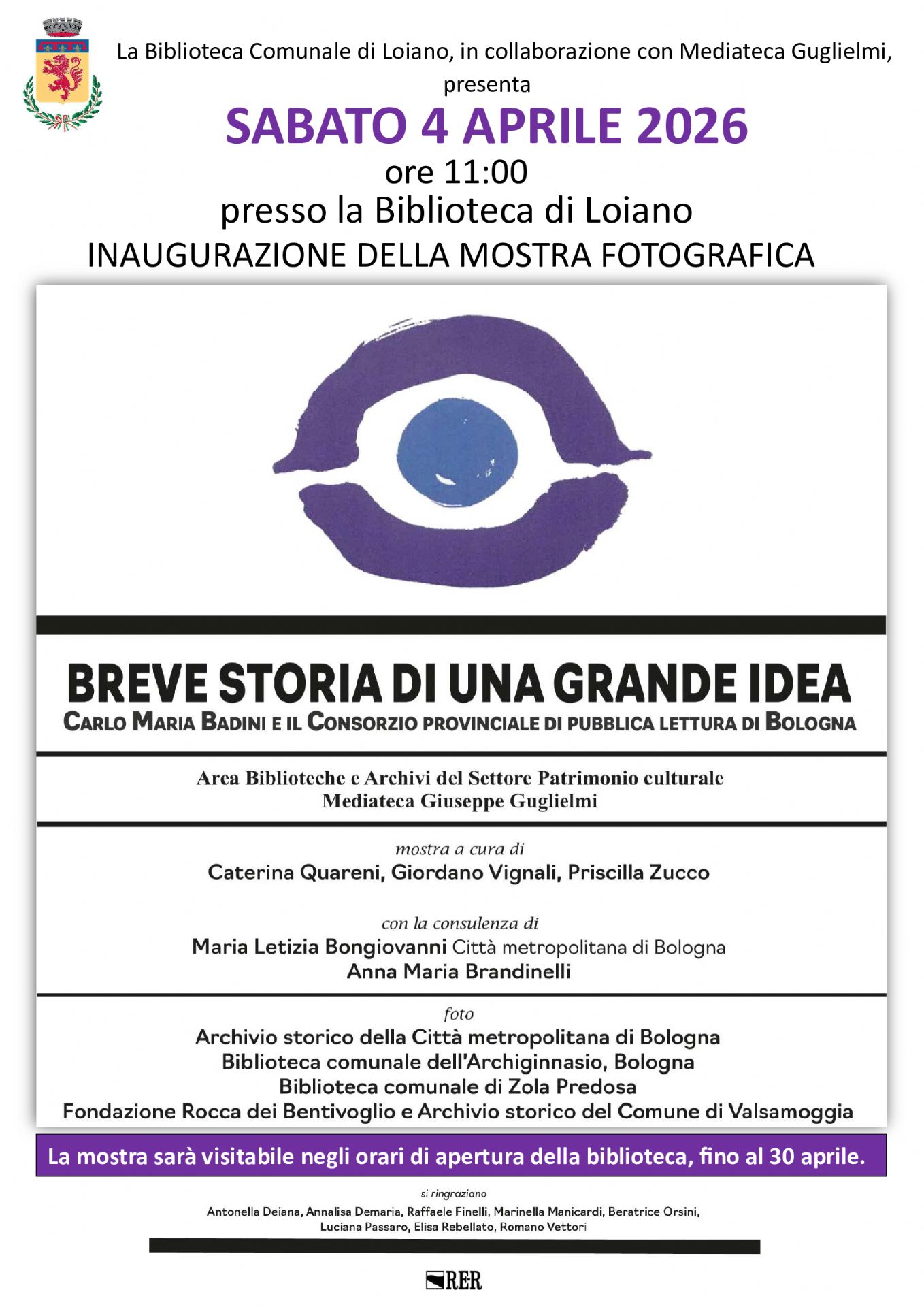 Sabato 4 aprile 2026, alle ore 11:00, presso la Biblioteca Comunale di Loiano (Via Roma n.55), si terrà l'inaugurazione della mostra fotografica "Breve storia di una grande idea", l'installazione itinerante dedicata a Carlo Maria Badini e al...