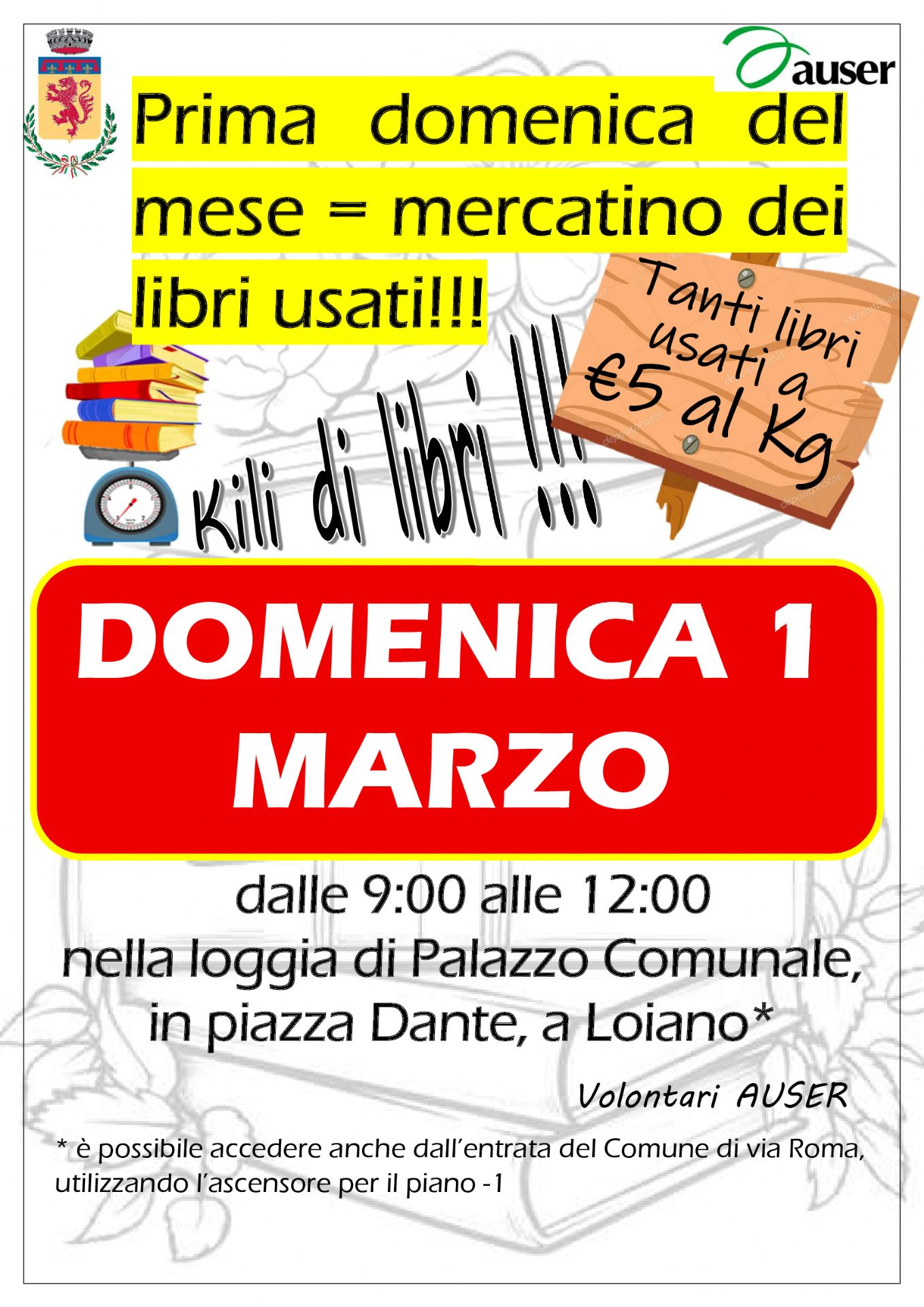 Come tutte le prime domeniche del mese, domenica 1° marzo 2026, dalle ore 9:00 alle ore 12.00, presso Piazza Dante (nella loggia del Palazzo Comunale), si terrà "Kili di libri!!!", l'ormai tradizionale mercatino di libri usati a cura dei volontari AUSER.