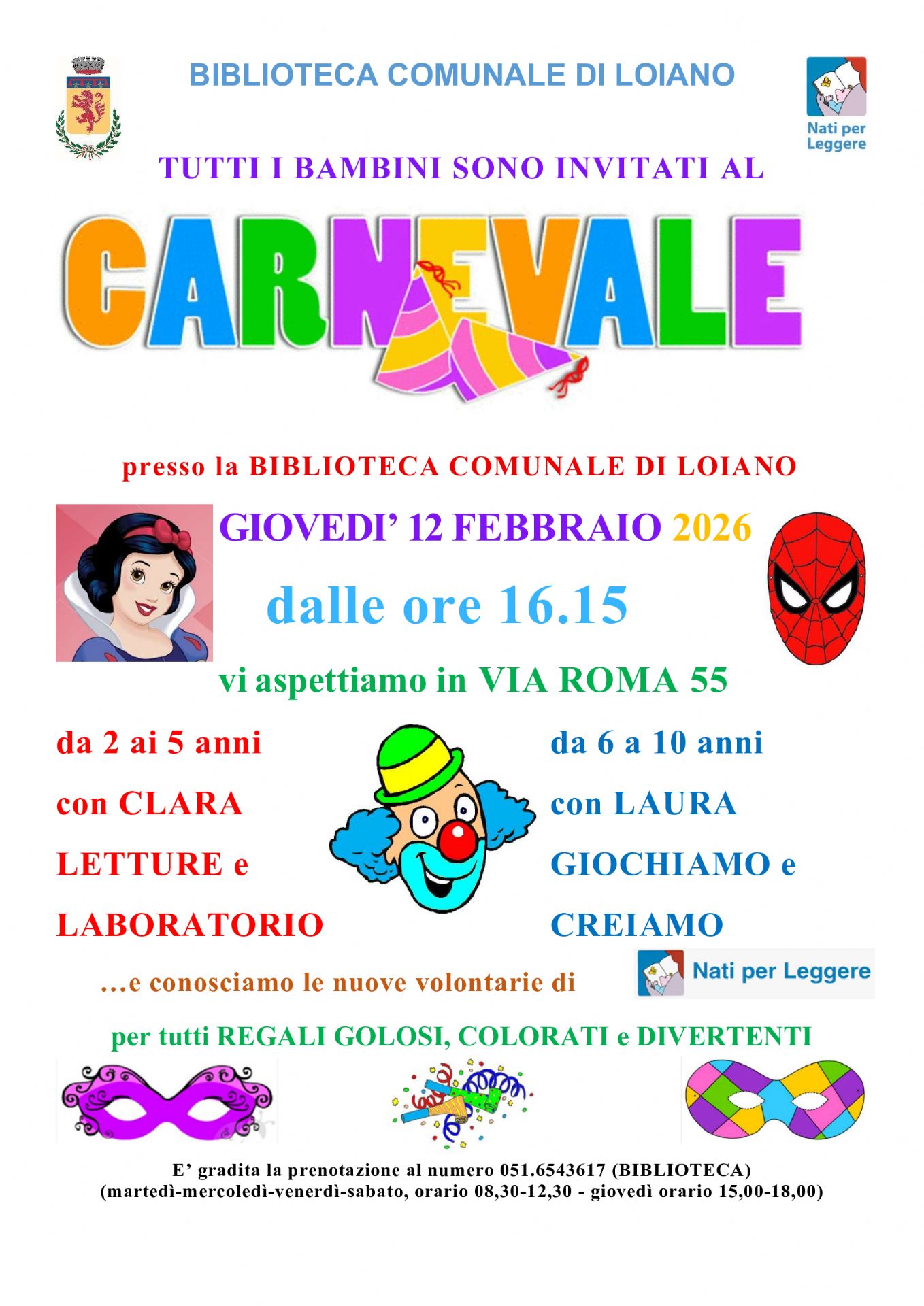 Giovedì 12 febbraio 2026, dalle ore 16:15, presso la Biblioteca Comunale di Loiano (Via Roma n. 55), si terrà la Festa di Carnevale 2026: un pomeriggio di divertimento a cui sono invitati tutti i bambini tra i 2 ed i 10 anni.