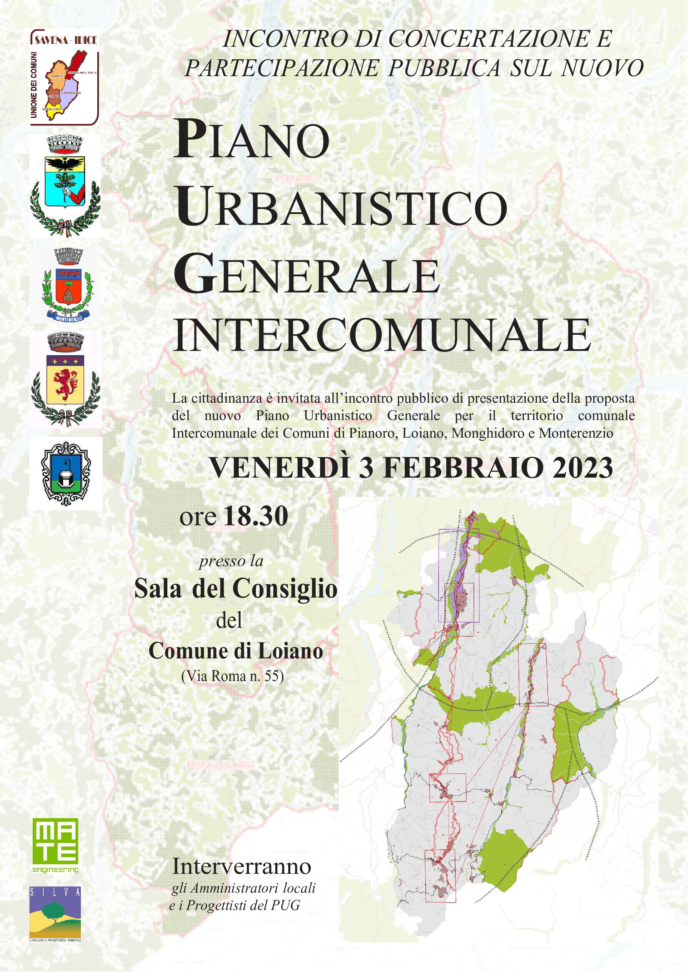 Venerdì 3 febbraio 2023, alle ore 18:30, presso la Sala del Consiglio del Comune di Loiano, si terrà l’incontro pubblico di presentazione della proposta del nuovo Piano Urbanistico Generale (PUG) per il territorio comunale Intercomunale dei Comuni di Pianoro, Loiano, Monghidoro e Monterenzio.