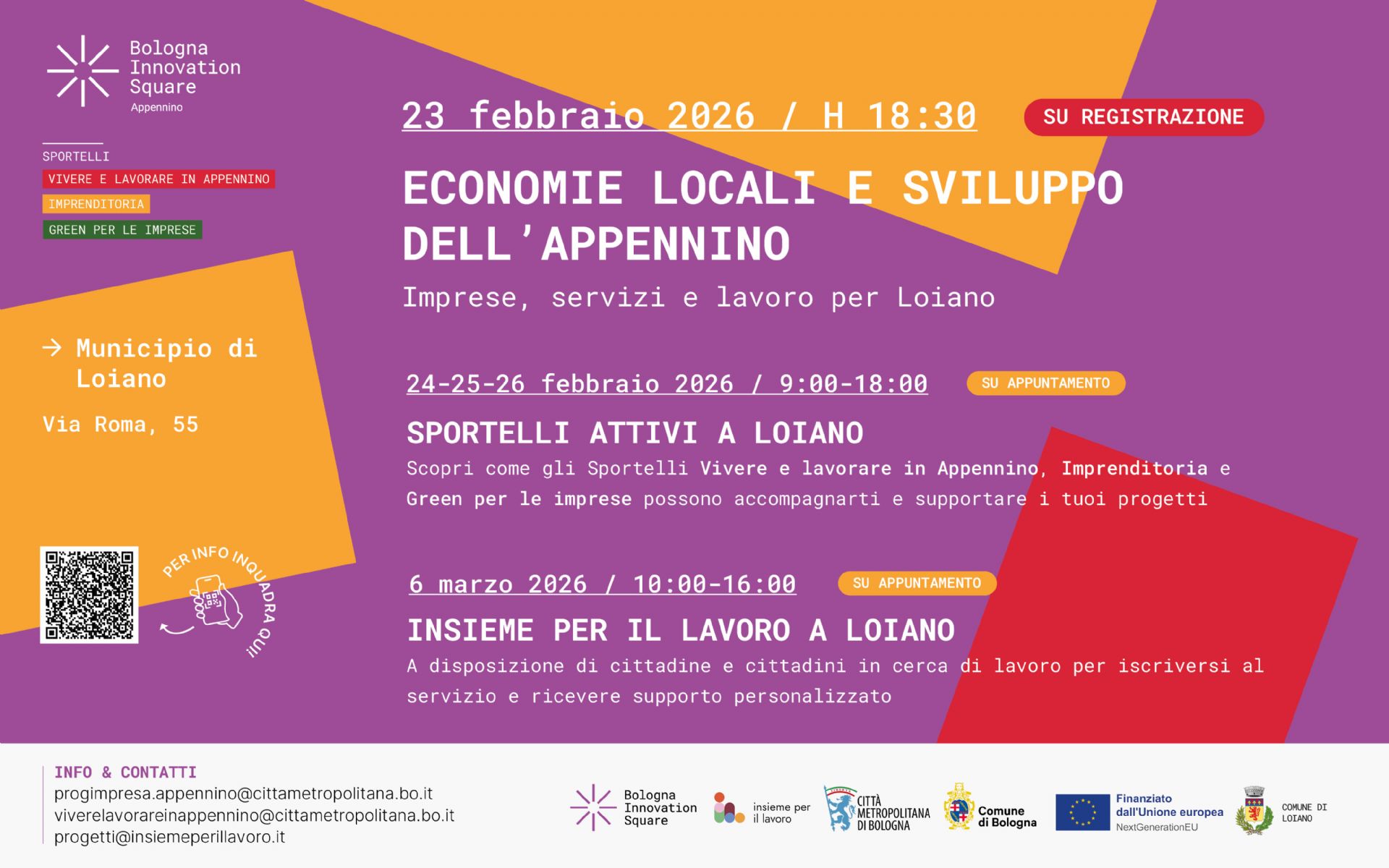 A seguito di questo incontro, dal 24 al 26 febbraio 2026, saranno attivi presso il Municipio di Loiano gli sportelli BIS ("Vivere e lavorare in Appennino", "Imprenditoria", "Green per le imprese"), a disposizione di tutti coloro che siano interessati a ricevere gratuitamente informazioni o accompagnamento dedicato per avviare un progetto di vita o d’impresa in Appennino, rilanciare la propria attività o renderla più sostenibile.